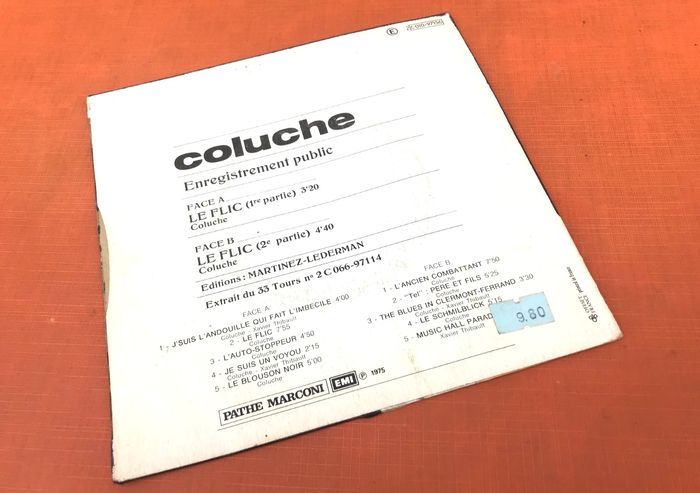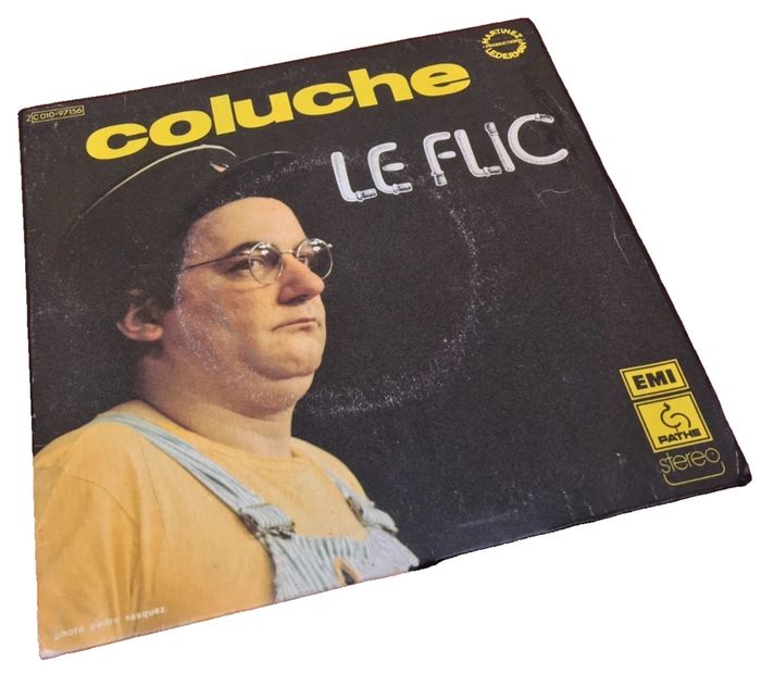 Vinyle 45 tours Coluche Le flic (1975) Pathé 2C 010-97156 A Le Flic (1ere Partie) 3:20 B Le Flic (2e Partie) 4:40