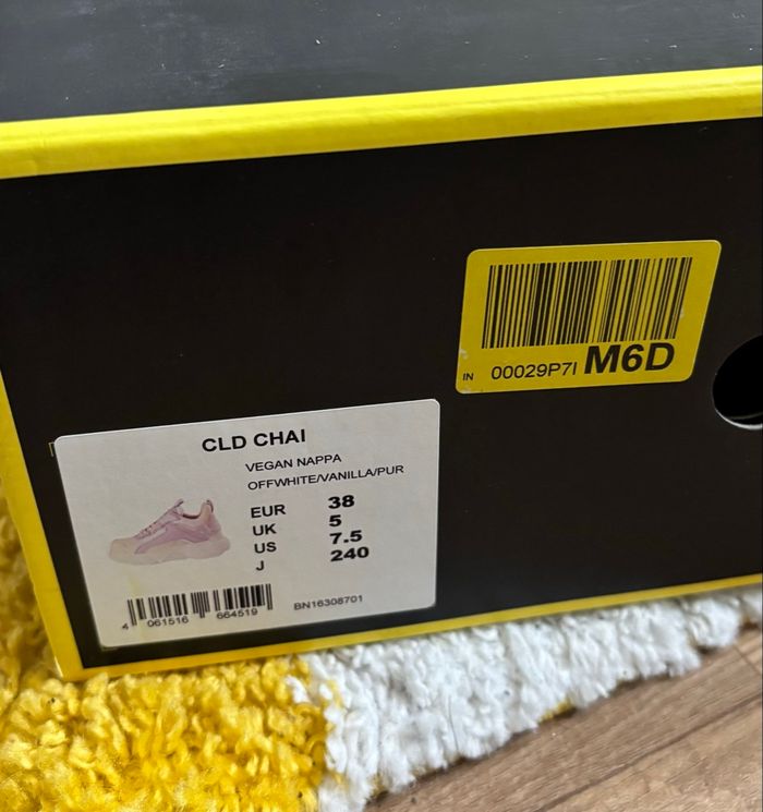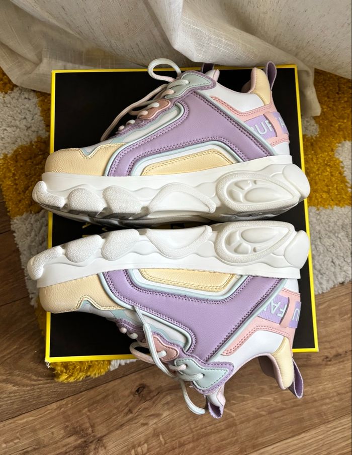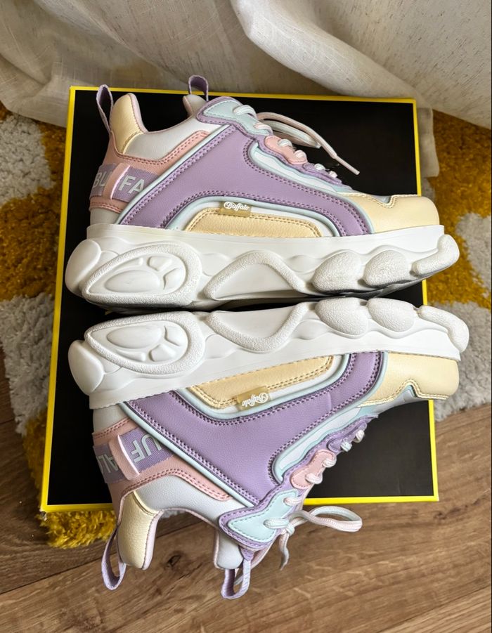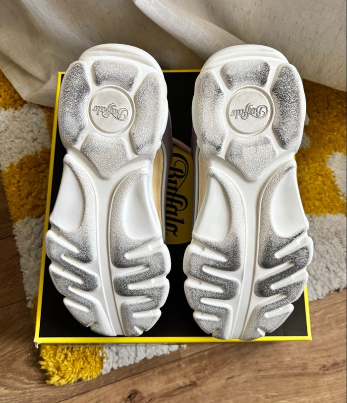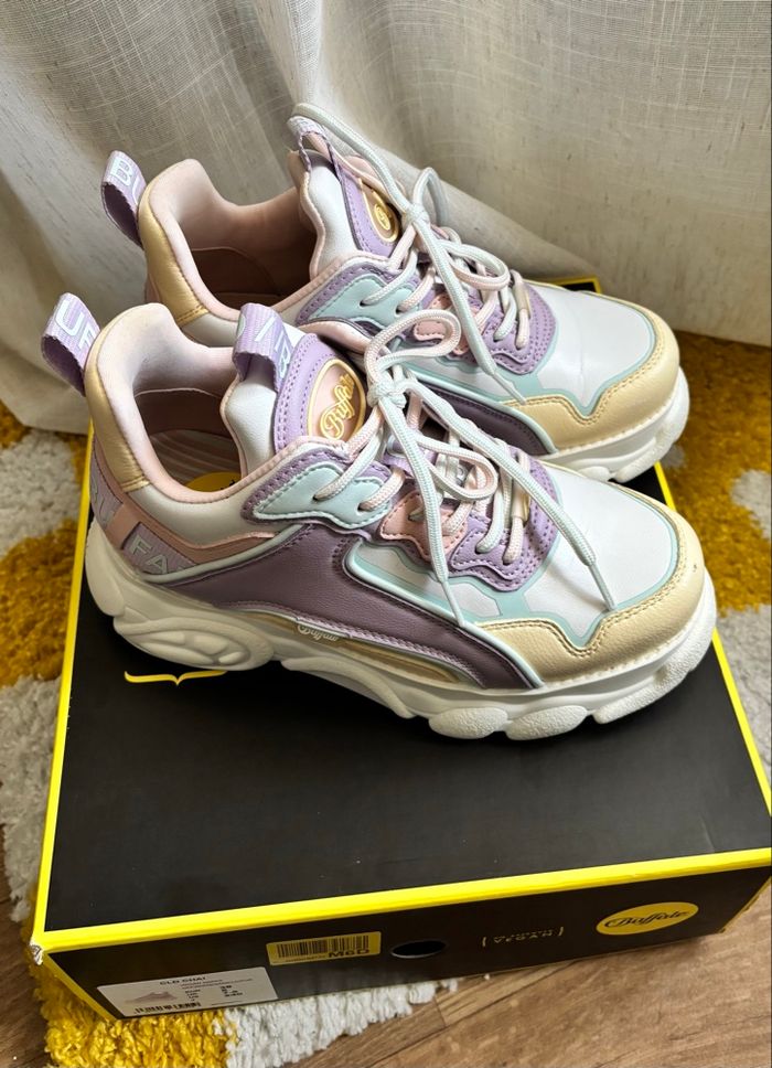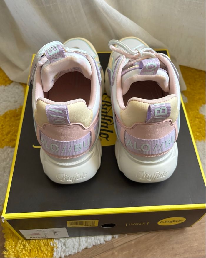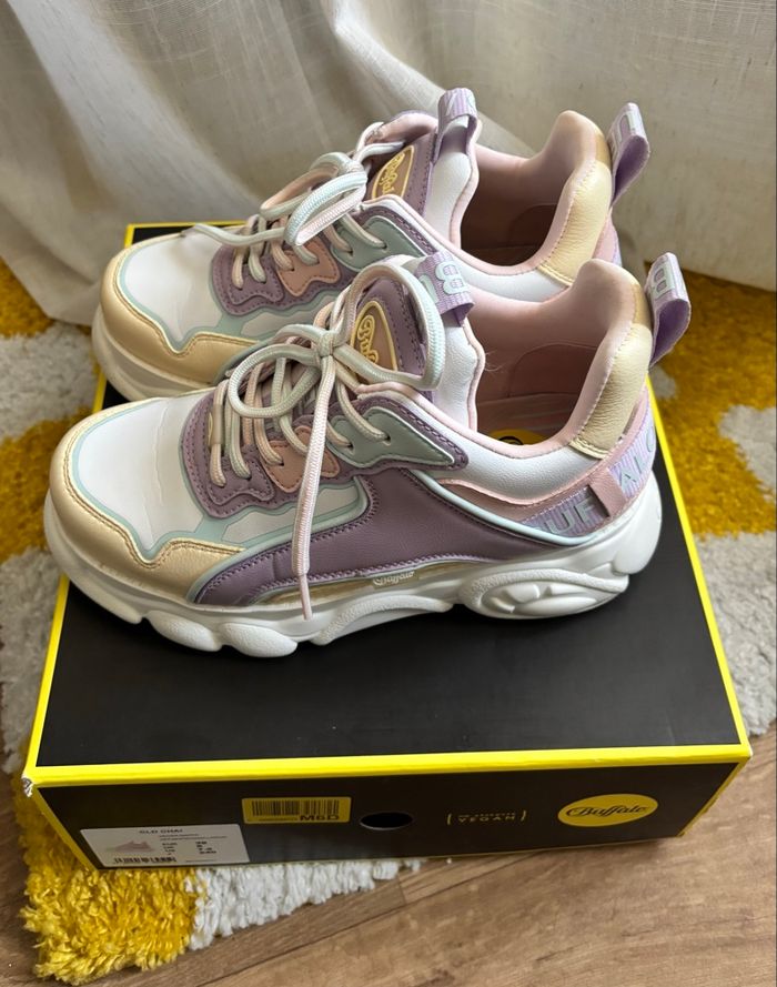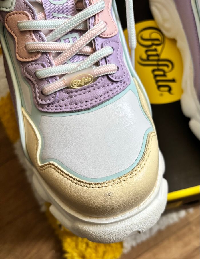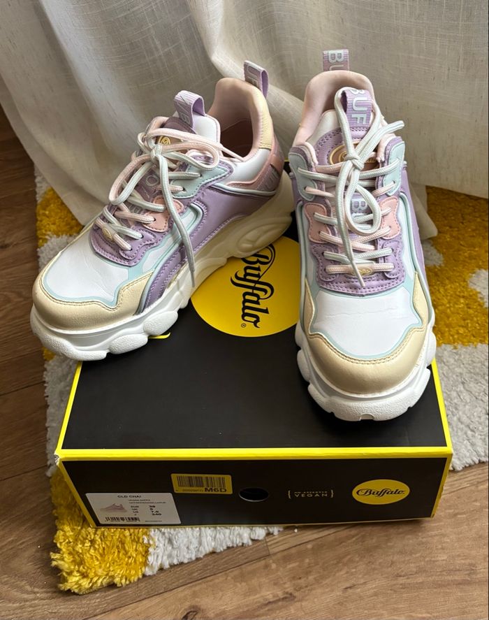 Buffalo CHAI off White / vanilla / purple Très bon état, porté une fois. Deux petits défauts sur le côté droit (voir photos). Avec sa boîte en bon état, légèrement abîmée. Pointure 38.