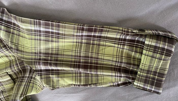 Chemise à carreaux col V 3 boutons 2 petites poches sur la poitrine Possibilité de faire des manches 3/4 Il n’y a plus l’étiquette de taille mais cela doit etre un 38/40, je vous mets toutes les mesures Large épaule 39 Poitrine 49 Longueur bras 61 Longueur 70