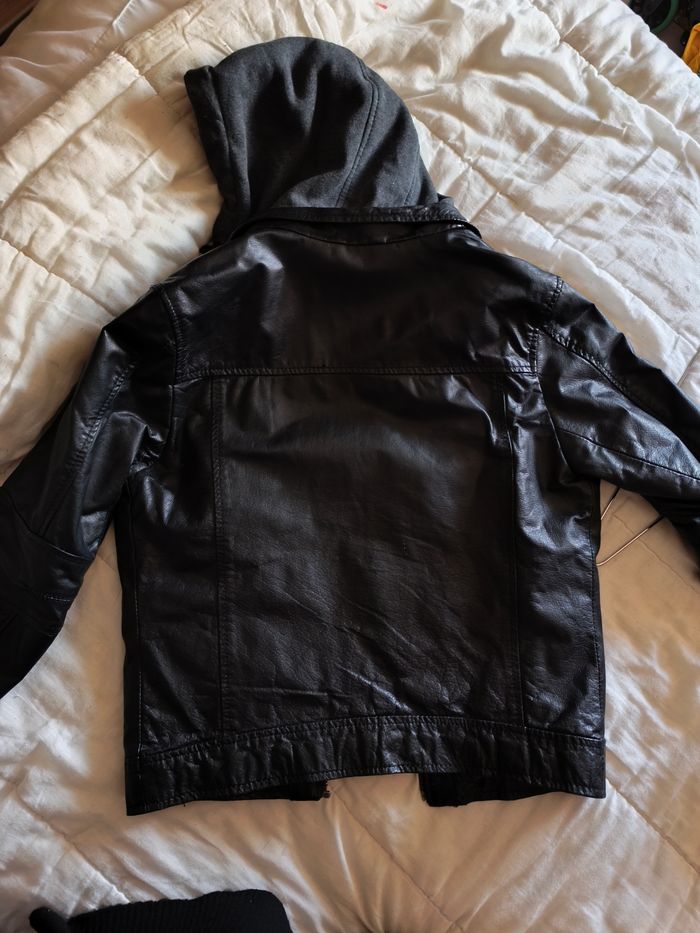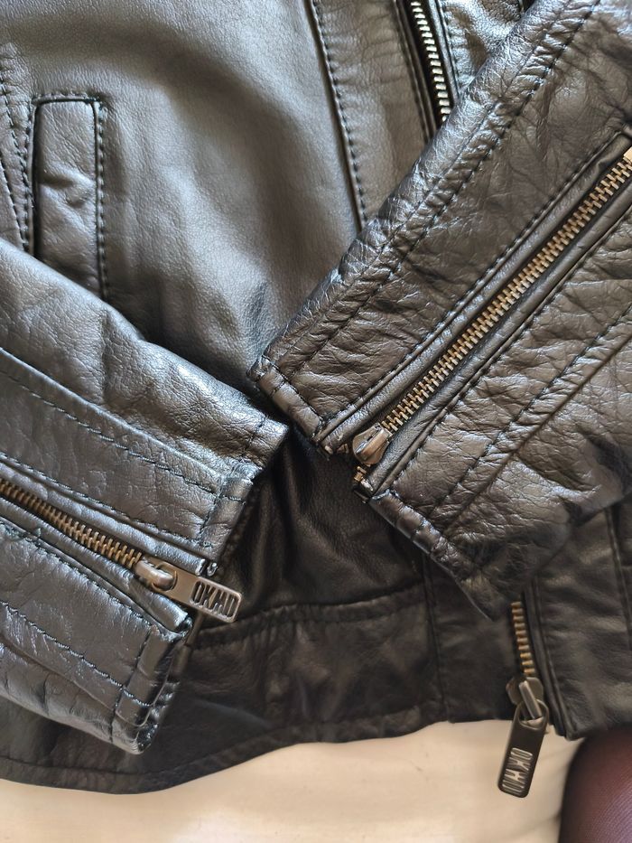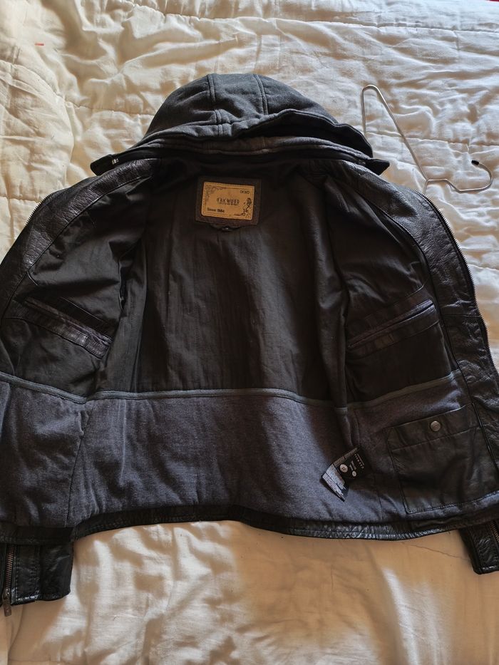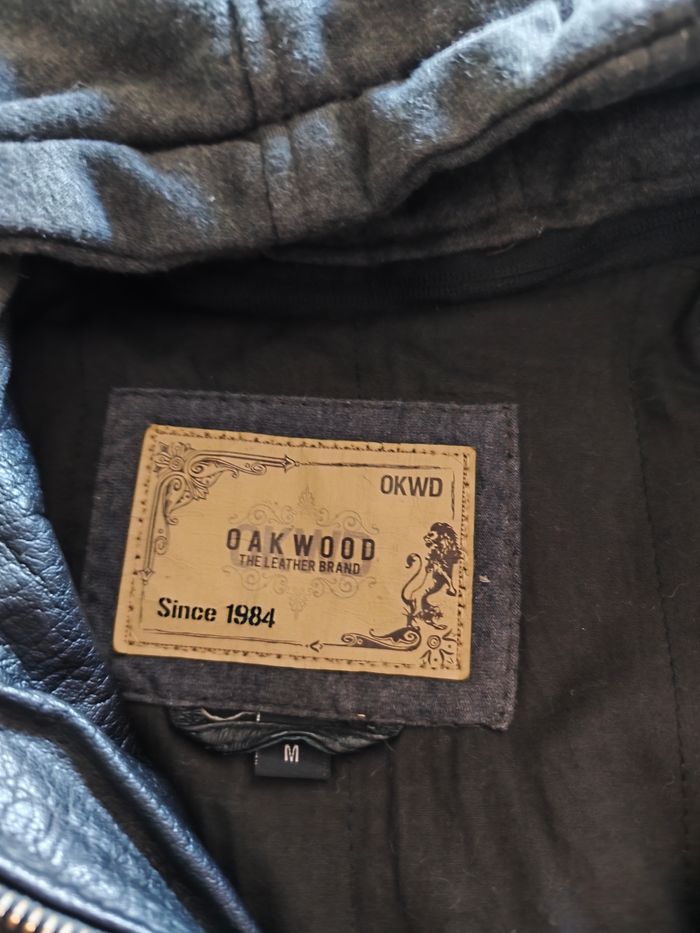 Très jolie veste en véritable cuir de buffle . Marque oakwood. Taille M. Capuche amovible. Très bon état ( tirette d'une manche manquante)