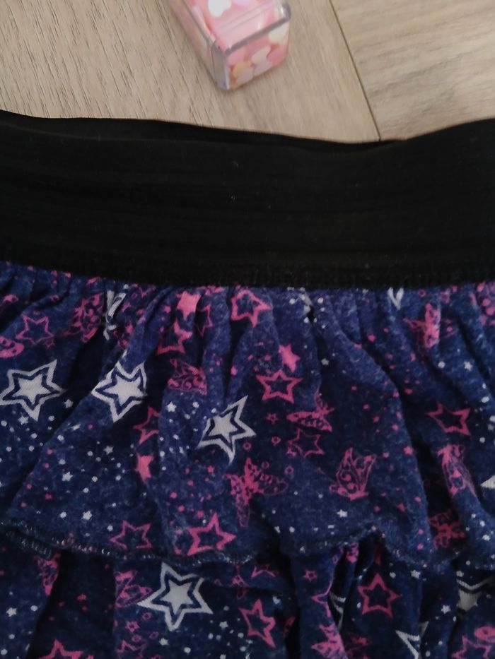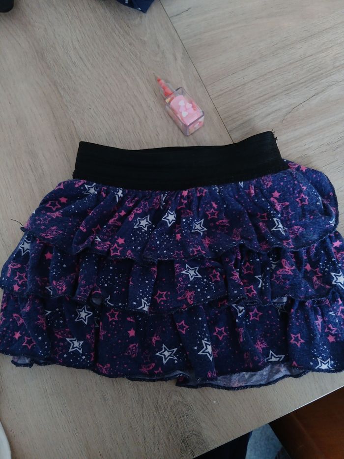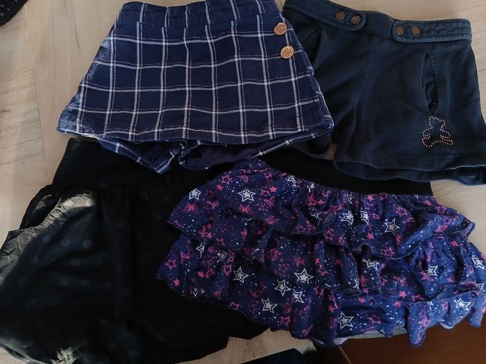 Lot fille taille 24mois et non l'âge indiqué sur les étiquettes. 2 shorts 1 noir lulu castagnette à poches et un violet rayé taille élastique et fermeture et 2 jupes taille élastique 1 noire à pois 2 poches et 1 bleu violette ,étoiles papillons rose fushia.