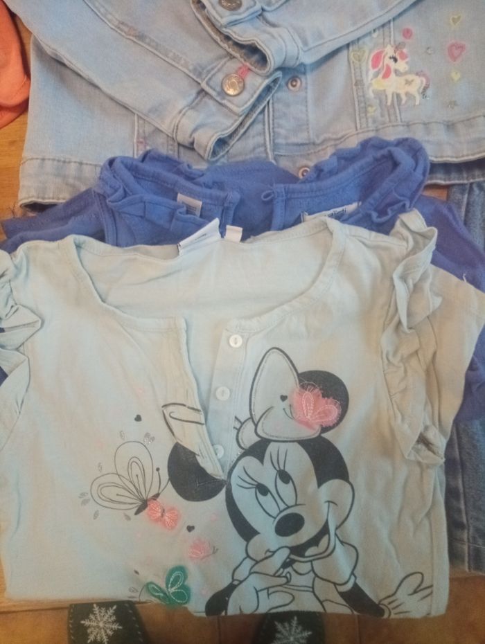 Lot vêtements été fille 5 ans 1 robe jean 1 blouson jean licorne 2 combishorts 2 shorts 10 Tee shirts 1 tunique paillettes perroquets 1 gilet 1 pyjama 1 Tee shirt manches longues