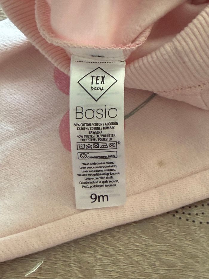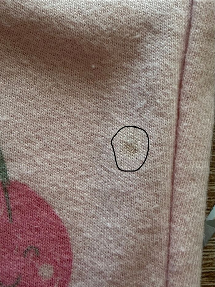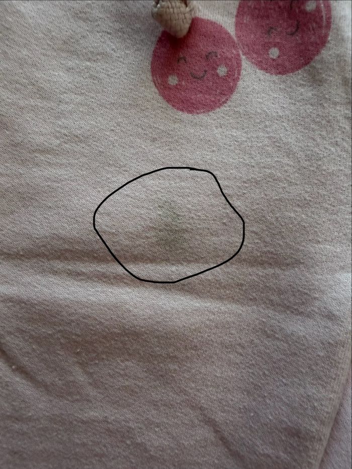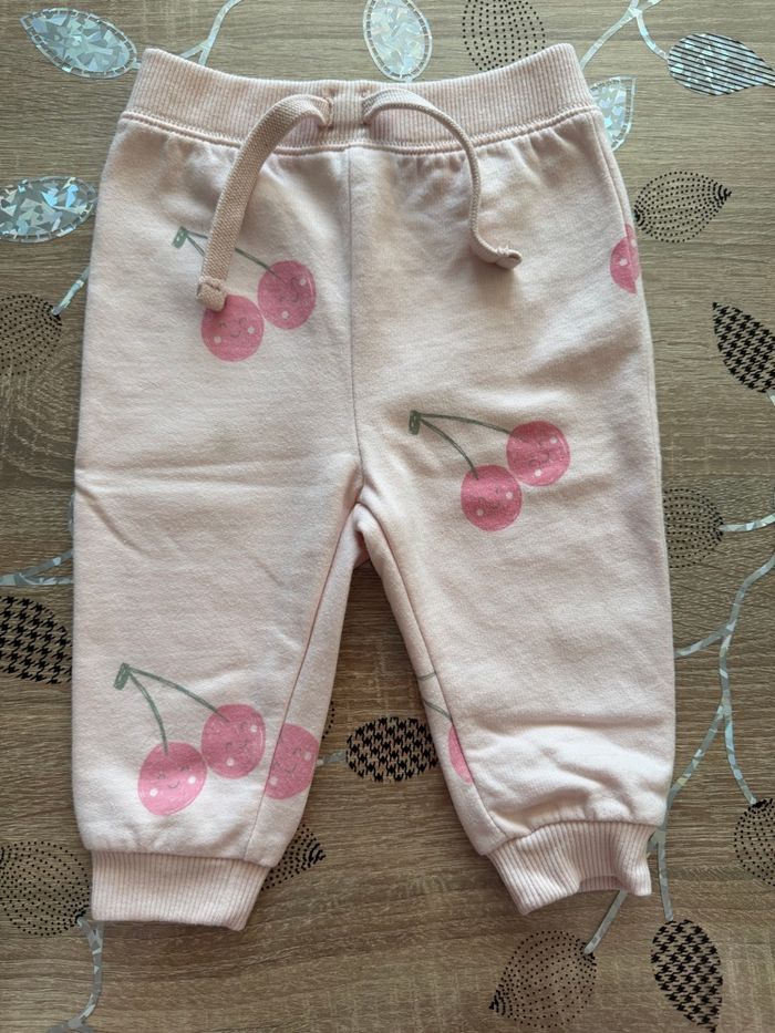 Pantalon jogging rose tout doux avec imprimé cerises. Taille élastique avec cordon, confortable et pratique au quotidien. Présente 2 taches voir photo Taille : 9 mois Marque : Tex baby