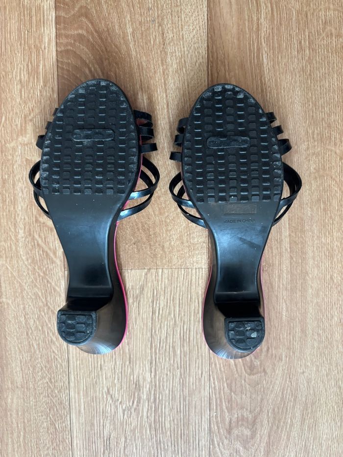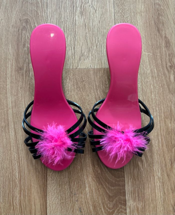 Je vends cette paire de sandales à talons pour fille en taille 28. En centimètres c’est 17 ,5 - Couleur : Noir et fushia - Matière : plastique et plume