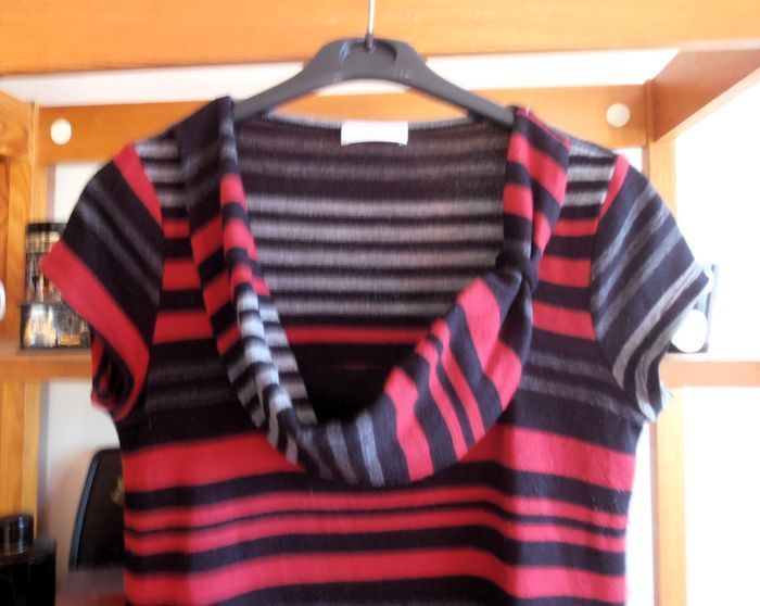 Sweat femme, tunique, marque : Cache Cache, taille L 40, couleurs: noir, gris, rouge, motif rayures. Col rond stylé, manches courtes, coupe droite longue, possibilité de passer une ceinture. Tissu fluide, agréable à porter. Très bon état. Style casual !