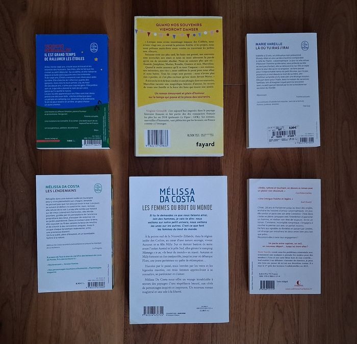Réduction possible de 30%, soit 24.5 € le lot en passant sur l’application Bee bs Kiabi. ⚠️Un livre a été vendu depuis la prise de photos. Cette annonces comprend 5 livres⚠️ ✏️ Les femmes du bout du monde Mélissa Da Costa Edition Albin Michel Prix éditeur : 21,90€ Très bon état - marque manuscrite sur première page et couverture marquée au dos ✏️ Les lendemains Mélissa Da Costa Edition Le livre de poche Prix éditeur : 8.90 € Très bon état - Couverture marquée au dos ✏️ Quand nos souvenirs viendront danser Virginie Grimaldi Edition Fayard Très bon état Prix éditeur : 18.50 € ✏️ Il est grand temps de rallumer les étoiles Virginie Grimaldi Edition Le livre de poche Très bon état Prix éditeur : 7.90 € ✏️ Là où tu iras, j’irai Marie Vareille Edition Le livre de poche Très bon état Prix éditeur : 9,20 € Je peux très bien me passer de toi (vendu) Marie Vareille Bien qu’en très bon état, il s’agit de livres d’occasion qui peuvent présenter des traces sur la couverture ou les coins. N’hésitez pas si vous souhaitez des photos supplémentaires. Livraison acceptée Ou remise en main propre possible sur Paris, La Défense, Bibliothèque François Mitterrand, Gare de Lyon, Etampes
