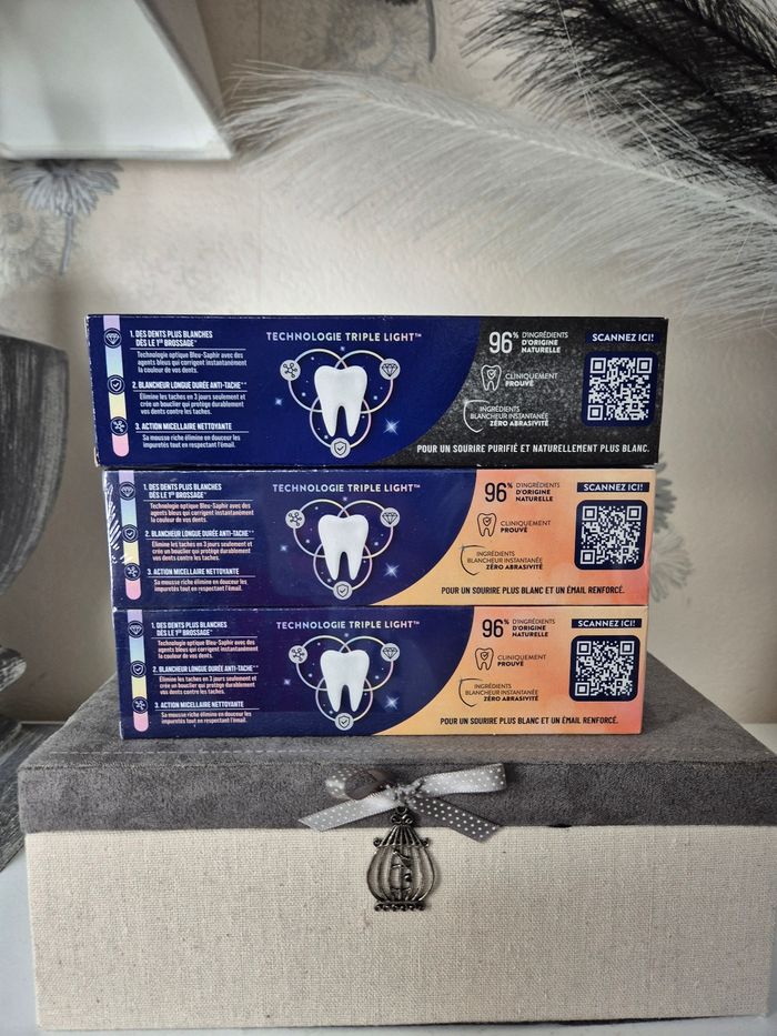 3 dentifrices, marque Signal, gamme WHITE NOW 3 EN 1 Dont: - 1 lot de 2 WHITE NOW 3 EN 1 "Shine with care" Email renforcé - 1 WHITE NOW 3 EN 1 "White Boost", au charbon actif 3 × 75 ml Articles NEUFS, jamais ouverts, cédés sous blister et emballage d'origine
