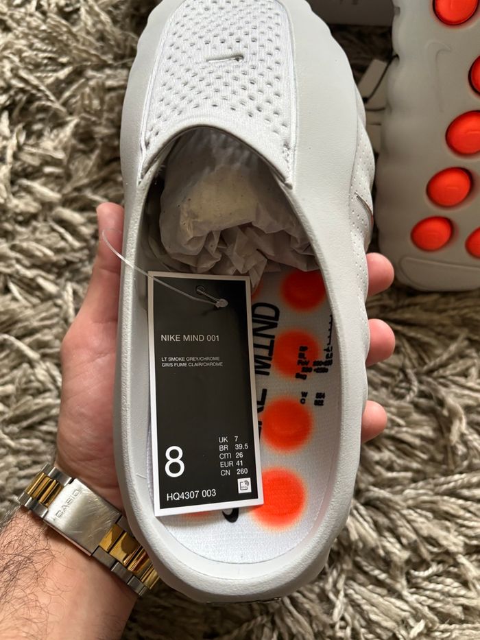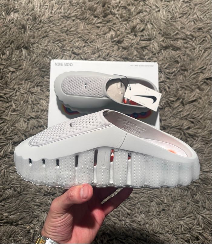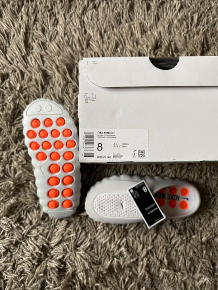Nike Mind 001 📏Taille: 44 🎨Couleur : gris ☁️Confort: semelle intérieur faite pour masser les pieds, c'est comme marcher sur un nuage ✅État : neuve jamais portée envoi: Jour de l'achat et jour d'après, toujours bien protégé ⚡️Disponibilité : Modèle très difficile à trouver en magasin et site internet (souvent Sold Out). Idéale pour chiller à la maison avec style ou pour sortir cet été. Si jamais vous avez besoin de plus d'infos, photos ou autre n'hésitez pas à me contacter🦦