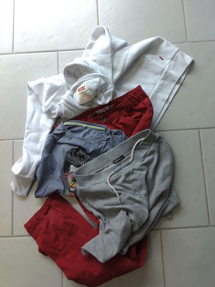 1 pantalon rouge in Extenso 1 sweat à capuche blanc levis 1short gris 1tee shirt bleu dessin homme name it Taille 14ans
