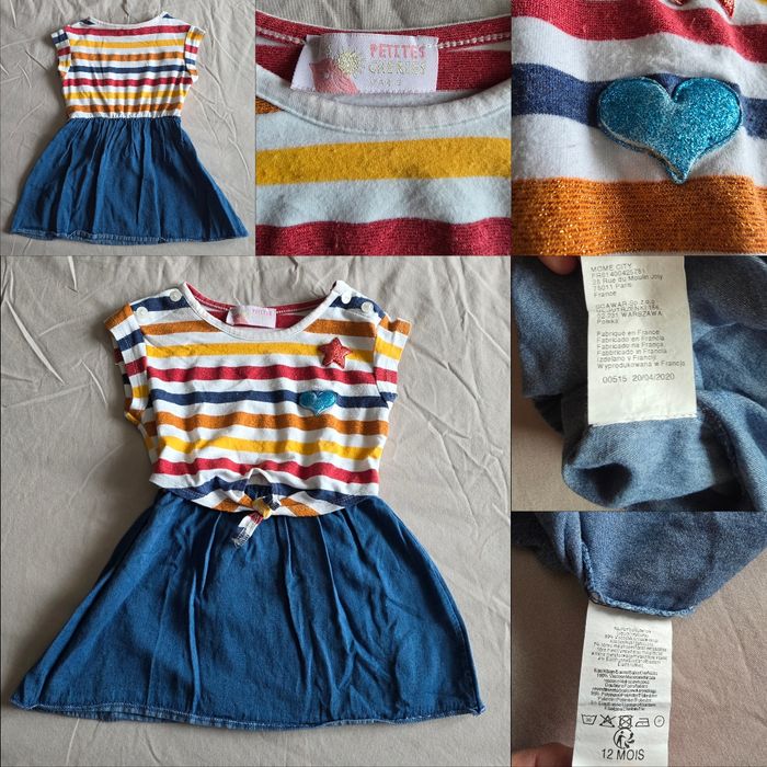 ​✨ ÉTAT : Bon état général. ​Robe rayée : Propre, l'écusson cœur bleu se décolle très légèrement sur un bord (réparable avec un point de colle textile ou de couture). ​Robe fleurs & débardeur coquillages : Très bon état, les couleurs sont vives et les imprimés intacts. ​📏 TAILLE & COUPE : 12 mois (Taille 80 pour le débardeur). Un ensemble parfait pour l'été avec des coupes fluides, des boutons-pression aux épaules ou à l'arrière pour un habillage facile. ​🌿 MATIÈRE : ​Robe rayée : Haut en viscose scintillante (fibres métallisées), bas aspect denim léger 100% Viscose. Fabriquée en France. ​Robe rose à fleurs : Mélange doux 60% Coton / 40% Polyester. ​Débardeur blanc : 100% Coton léger avec motif étoile de mer à paillettes. ​📦 LIVRAISON : Envoi via Mondial Relay (lockers), Shop2Shop ou Chronopost (point relais physique). ​🎁 Des réductions sur les lots sont activées pour se faire plaisir à petit prix ! *Articles vendus en lot de préférence, mais possibilité de les dissocier si besoin.