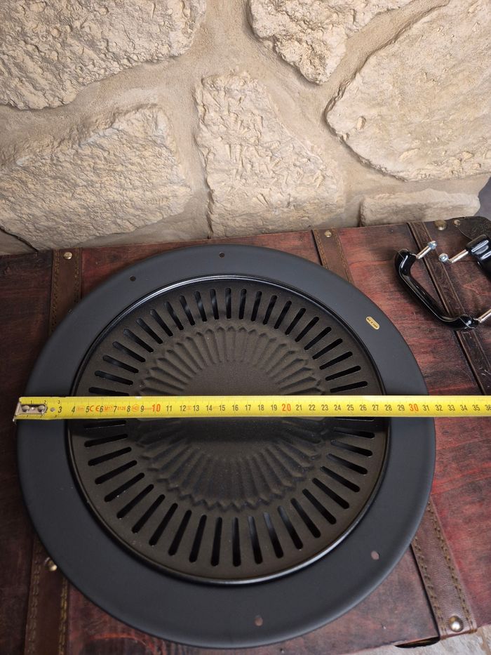 Poêle à barbecue coréen d'intérieur ou extérieur / Plaque grill pour gazinière, cuisinière, réchaud à gaz Idéal pour faire griller différents types de viande et de légumes entre amis ou en famille Bac collecteur de graisse en périphérie et grille anti-adhésive Répartition uniforme de la chaleur 2 poignées à monter Diamètre : 31,5 cm Article neuf, jamais utilisé, cédé dans ses emballages d'origine