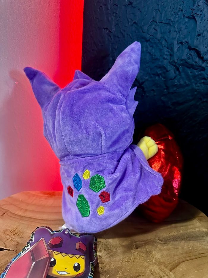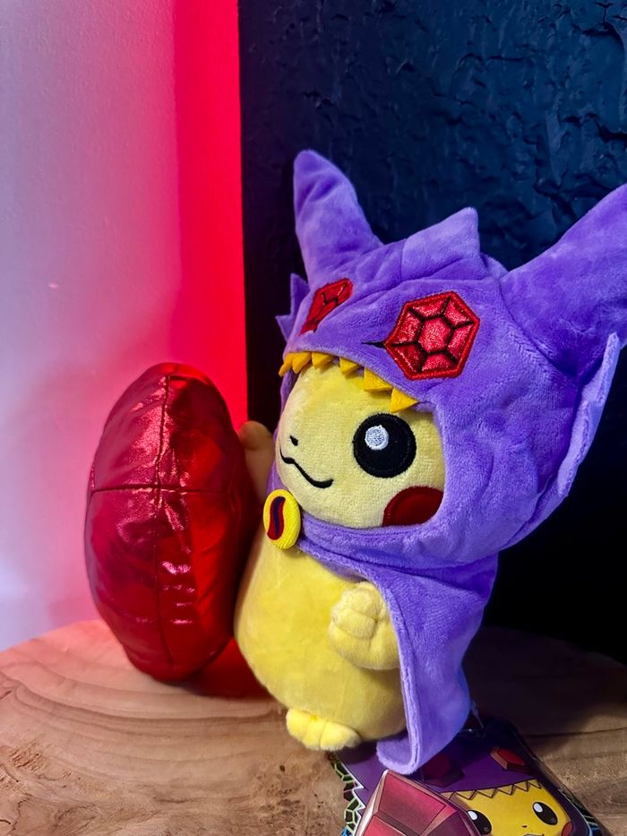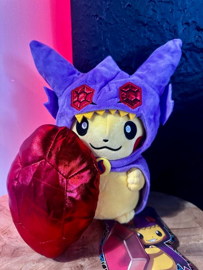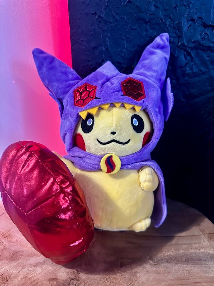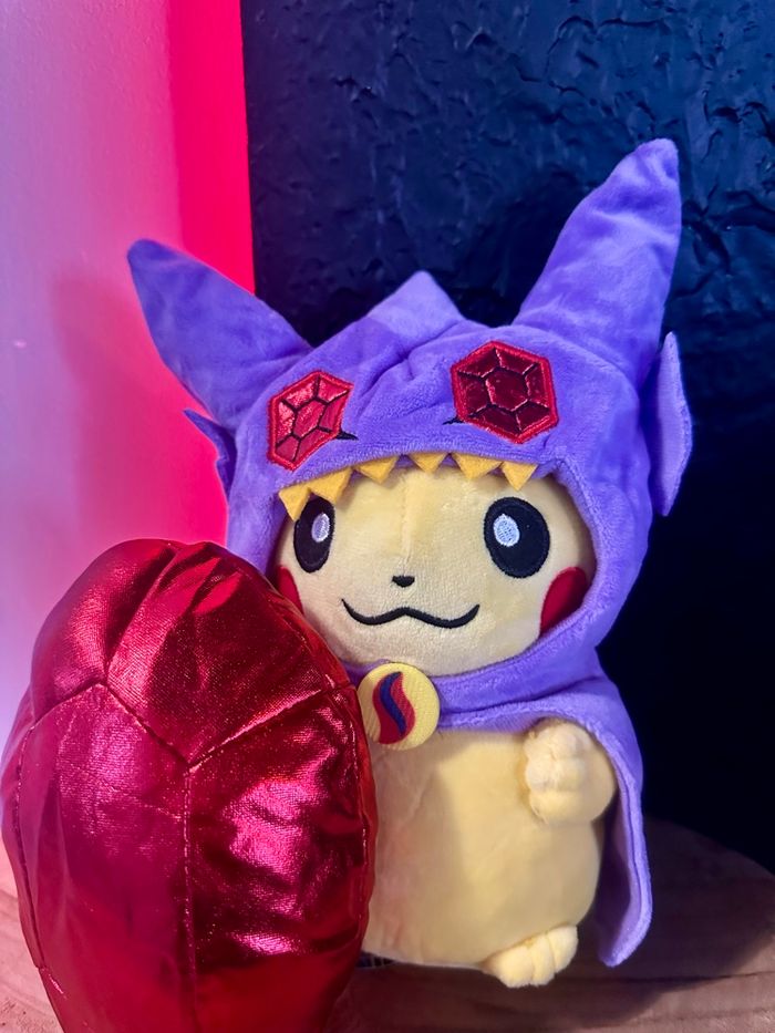 Superbe peluche Pikachu déguisé en Mewtwo, modèle original et très stylé ⚡ Costume violet avec oreilles pointues, détails brodés et gros cristal rouge inclus, pour un rendu vraiment impressionnant. Design unique qui se démarque des peluches Pokémon classiques. Peluche Pokémon, idéale pour les collectionneurs ou pour une déco gaming / geek 🎮 Étiquette visible sur les photos. Envoi rapide et soigné 📦