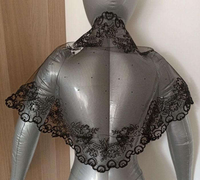 Vend étole en dentelle noire transparente avec motifs floraux, finitions festonnées, élégante et raffinée La dentelle est fine et travaillée, avec de jolis détails brodés. Elle peut se porter sur les épaules, en châle ou en étole autour du cou. État : très bon état Couleur : noir Matière : dentelle fine #etole #chale #dentelle #dentellenoire #elegant #tenuehabillee #mariage #ceremonie #soiree #vintagechic #accessoirefemme #modefemme #lookchic #feminin #romantique