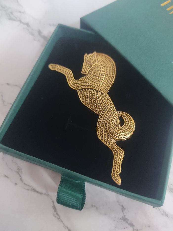 Très mignonne petite broche d'un cheval doré et sculpté dans un style de l'antiquité gréco-romaine ! 😍 Dimensions : 8cm x 3.5cm Parfaite sur un costume, châle, sac... Neuve, jamais portée ! Vendue avec sa boîte coffret cadeau avec éponge 🎁 #brochedorée #brochecheval #brocheantiquité #brooch #broach #goldenbrooch #horsebrooch