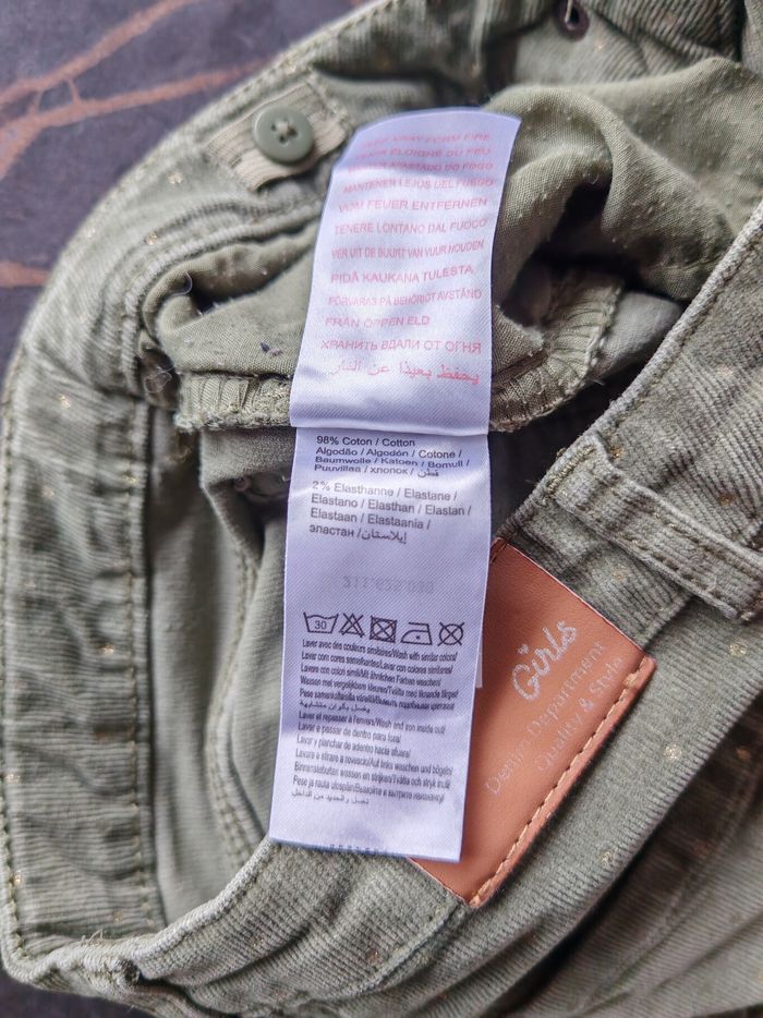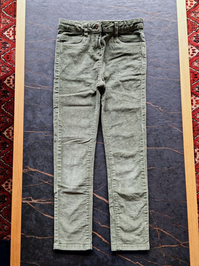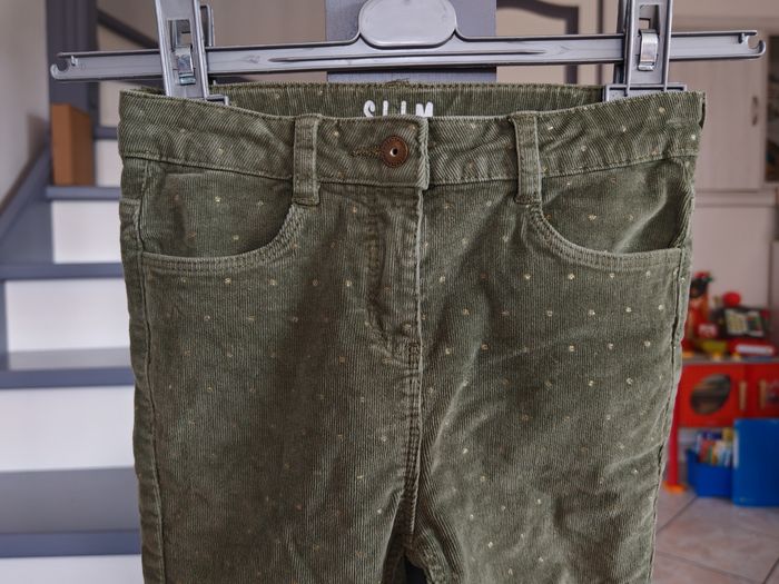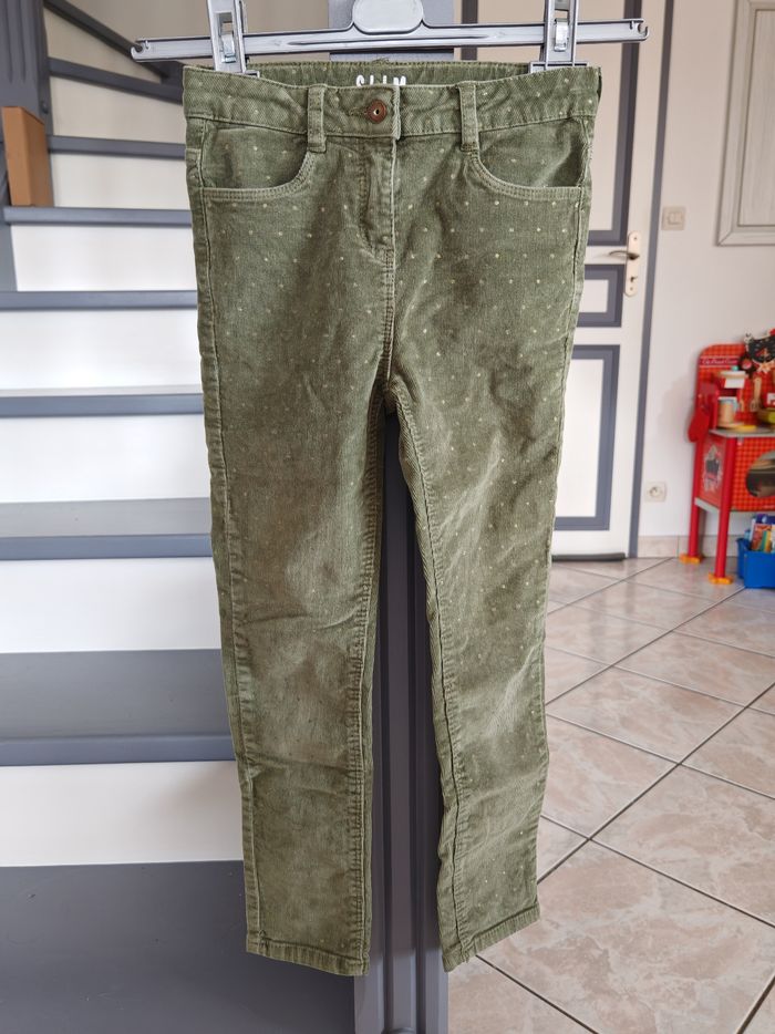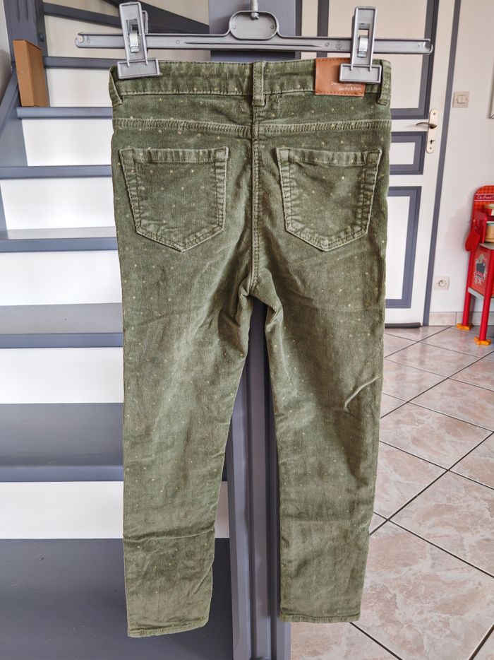 Pantalon en velours vert kaki avec des pois dorés Vertbaudet, 8 ans, en très bon état. En coton et elasthanne, coupe slim, taille réglable. Les pois dorés ont tendance à disparaître sur les genoux. Pour la couleur, se référer plutôt aux dernières photos, plus fidèles.