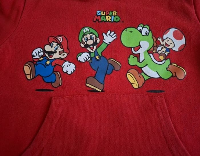 ​🍄 Sweat à capuche Super Mario - 4 ans ​Description : Vends sweat à capuche rouge vif aux couleurs de l'univers Super Mario. Un indispensable pour les petits fans de Nintendo ! ​Motif : Illustration colorée avec Mario, Luigi, Yoshi et Toad. ​Taille : 4 ans. ​Couleur : Rouge. ​État : Bon état général. ​Détails : * Capuche intégrée. ​Poche kangourou à l'avant. ​Étiquette officielle "Super Mario" au col. ​Envoi rapide et soigné 📦.