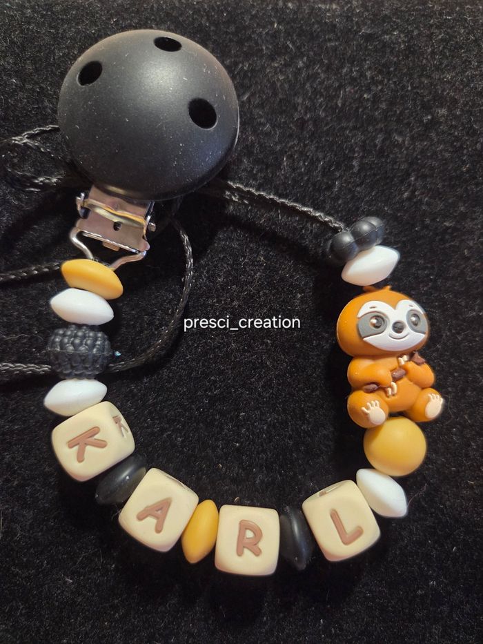 Attache tétine silicone paresseux 🌟Fil doublé 🌟Nœud de sécurité et nœud anti coulissement 🌟Taille respecter de 22 cm Thème au choix Possibilité de prénom en fluo dans la nuit pour un supplément me contactez Me contactez
