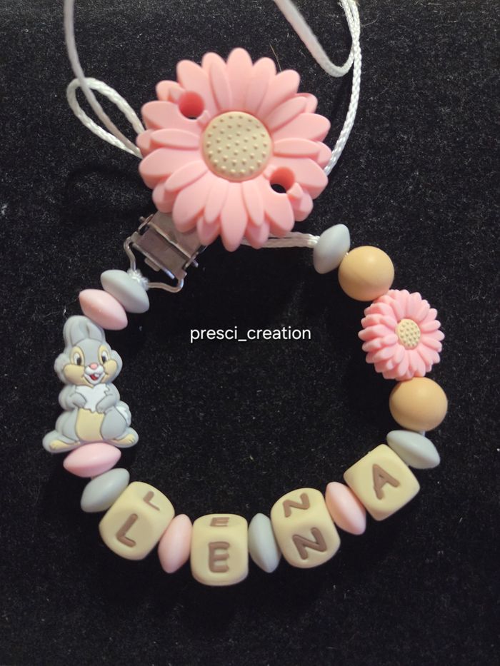Attache tétine silicone panpan fleur 🌟Fil doublé 🌟Nœud de sécurité et nœud anti coulissement 🌟Taille respecter de 22 cm Thème au choix Possibilité de prénom en fluo dans la nuit pour un supplément me contactez Me contactez
