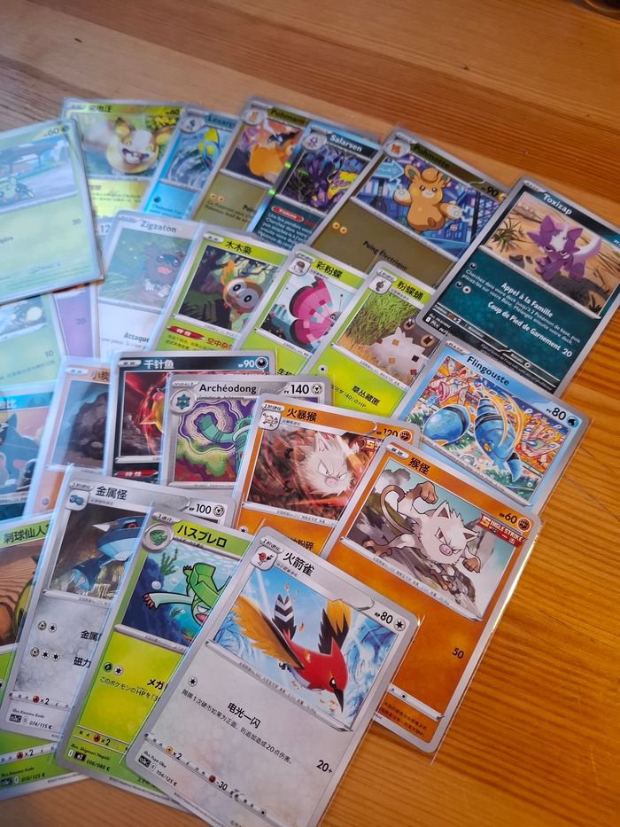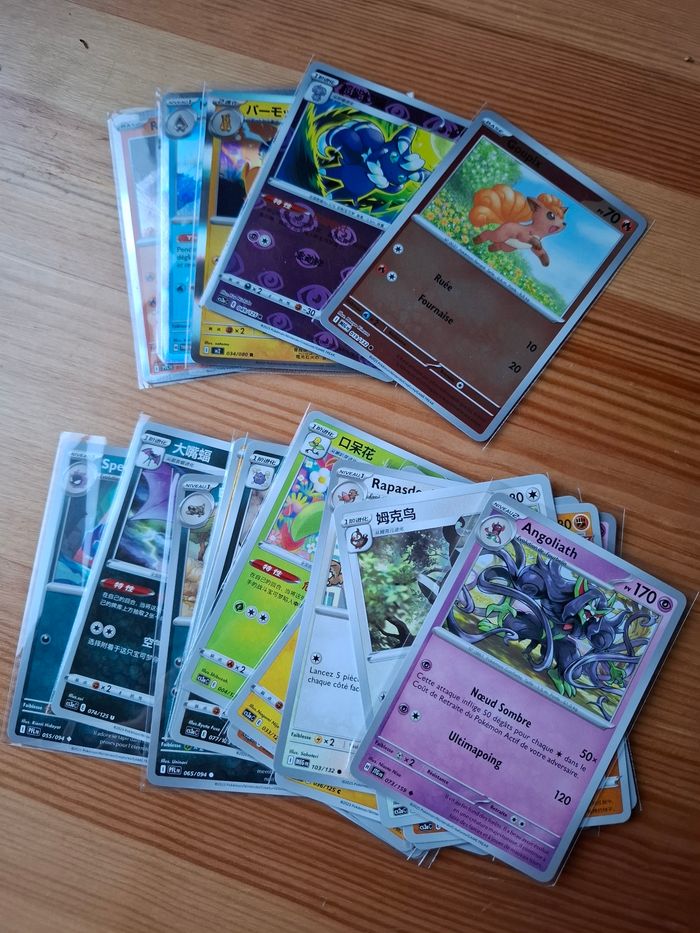 vends classeur de 144 cartes pokémon Français et chinoise originales. ✨ 30 cartes holographiques (brillantes). 🃏 114 cartes communes. 📁 classeur de rangement inclus. parfait pour un cadeau ou pour débuter une collection. état : très bon. envoi rapide et soigné.