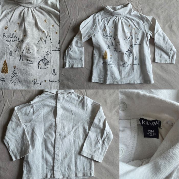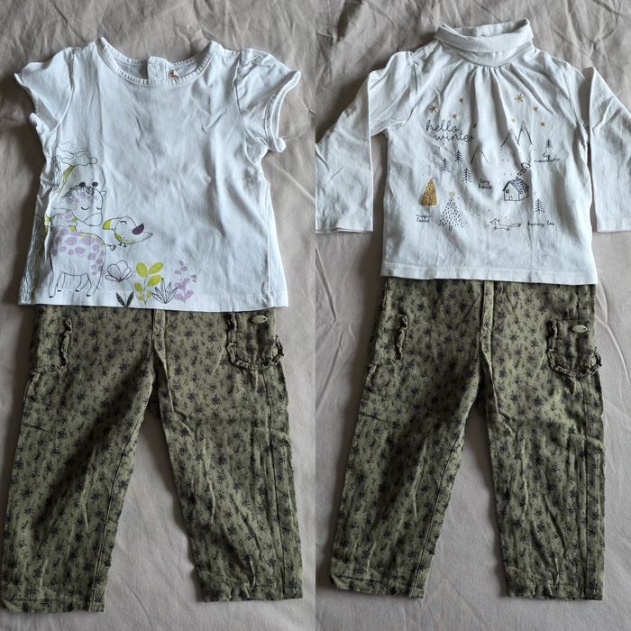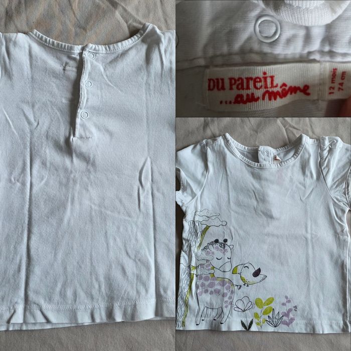 ​✨ ÉTAT : Très bon état général. Les vêtements ont été soigneusement entretenus : le blanc est resté bien lumineux, les motifs (girafe, toucan et imprimé hivernal) ainsi que les paillettes dorées sont intacts. Aucune tache ni trou. ​📏 TAILLE & COUPE : 12 mois (74 cm). Ce lot comprend : ​1 Pantalon Tartine et Chocolat fleuri avec taille ajustable (élastiques intérieurs). ​1 Sous-pull Kiabi à col montant, ouverture complète par pressions au dos. ​1 T-shirt manches courtes DPAM (Du Pareil au Même), ouverture par pressions au dos. ​🌿 MATIÈRE : 100% Coton pour le pantalon et le t-shirt. Le sous-pull est en 96% Coton et 4% Élasthanne pour plus de souplesse. Des matières douces et respirantes, idéales pour la peau de bébé. ​📦 LIVRAISON : Envoi via Mondial Relay (lockers), Shop2Shop ou Chronopost (point relais physique). ​🎁 Réductions sur les lots activées ! C'est le moment idéal pour compléter la garde-robe de votre petite fille à prix doux.
