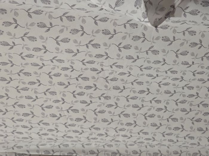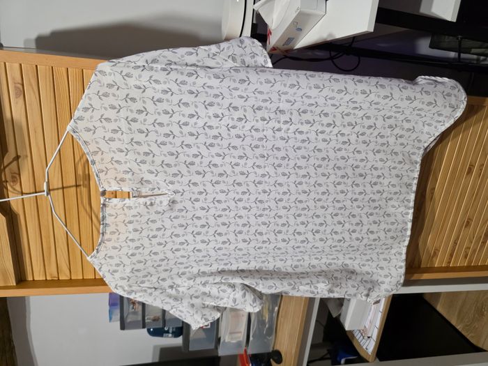 Blouse légère de couleur écrue avec imprimé feuillage discret, élégante et facile à porter. Manches courtes légèrement volantées et coupe fluide pour un rendu féminin et confortable. Fermeture discrète au dos par bouton. Matière en 100 % polyester, légère et agréable pour la saison estivale. Détails : Marque : Benetton Taille : M (équivaut à 38) Longueur : 63 cm Largeur poitrine : 55 cm Motif : Imprimé Couleur : Écru Matière : 100 % polyester Saison : Printemps / Été État : Parfait état