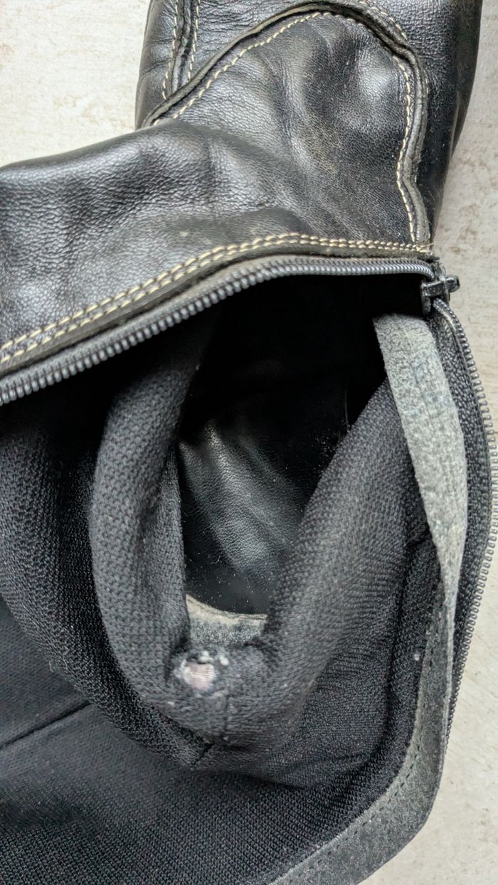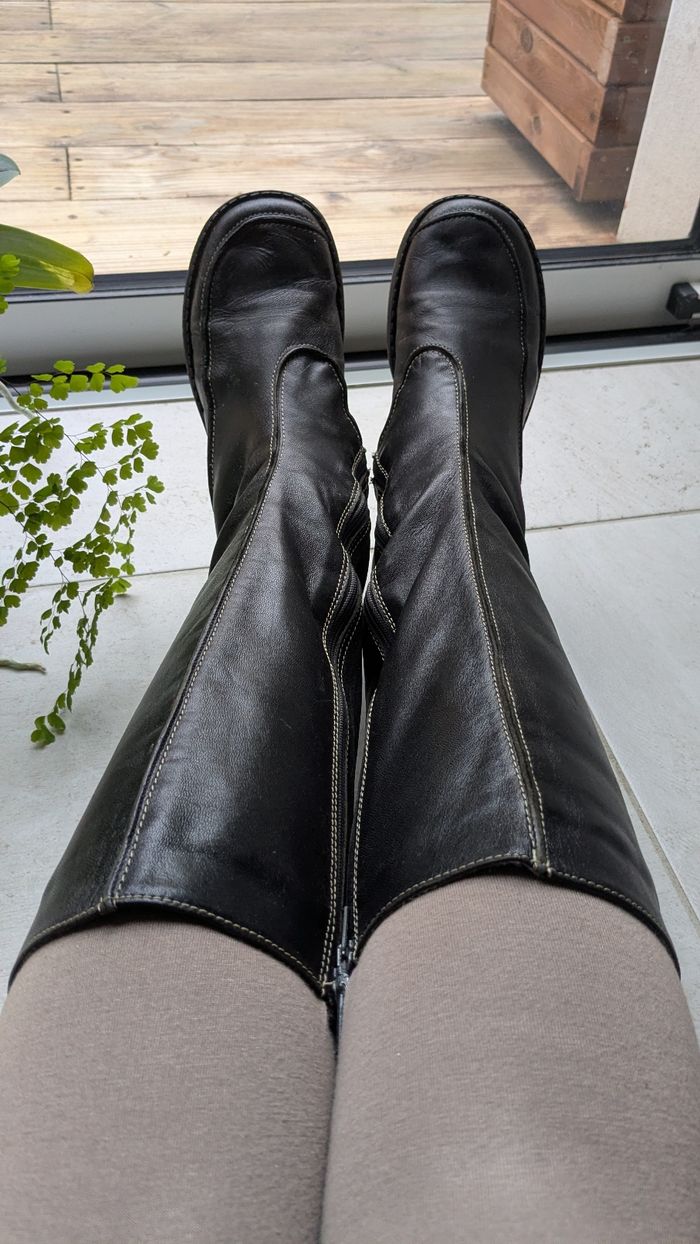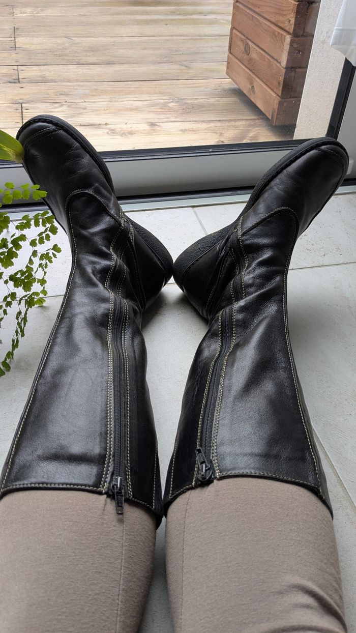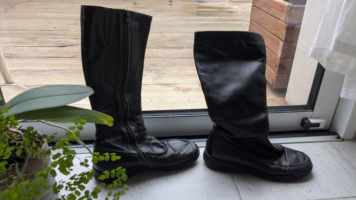 Bottes noires avec coutures beige apparentes Dessous genou Sans talon A porter avec une semelle fine car les semelles intérieures se decollent aux talons mais sont intactes Petite imperfection sur le tissu intérieur botte gauche (cf photo) Taille 37