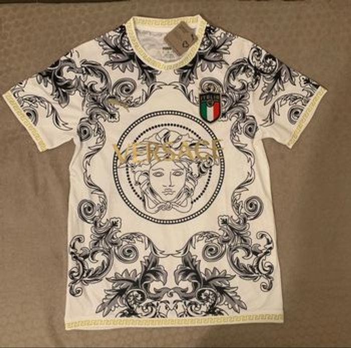 Maillot Italie Versace Taille S Neuf avec étiquette Négociable Déposer le jour de l’achat N’hésitez pas à allé sur mon compte pour plus de maillot ou de posez des questions Concept