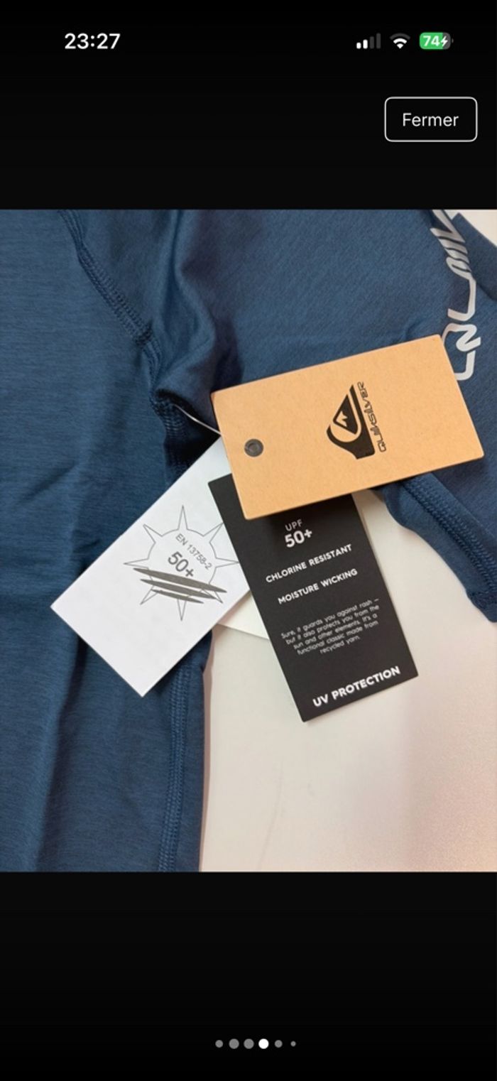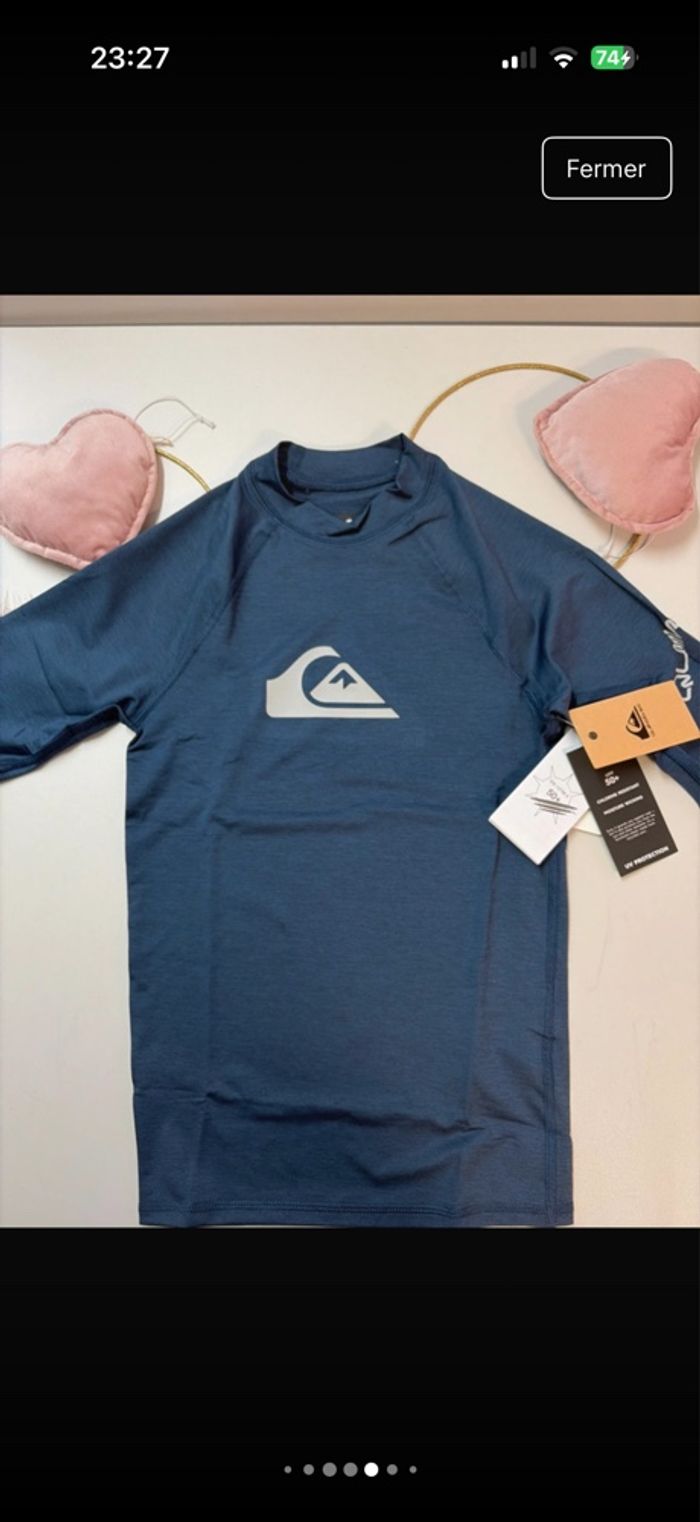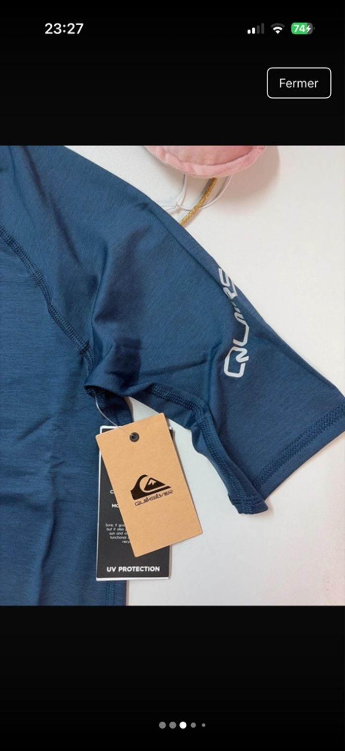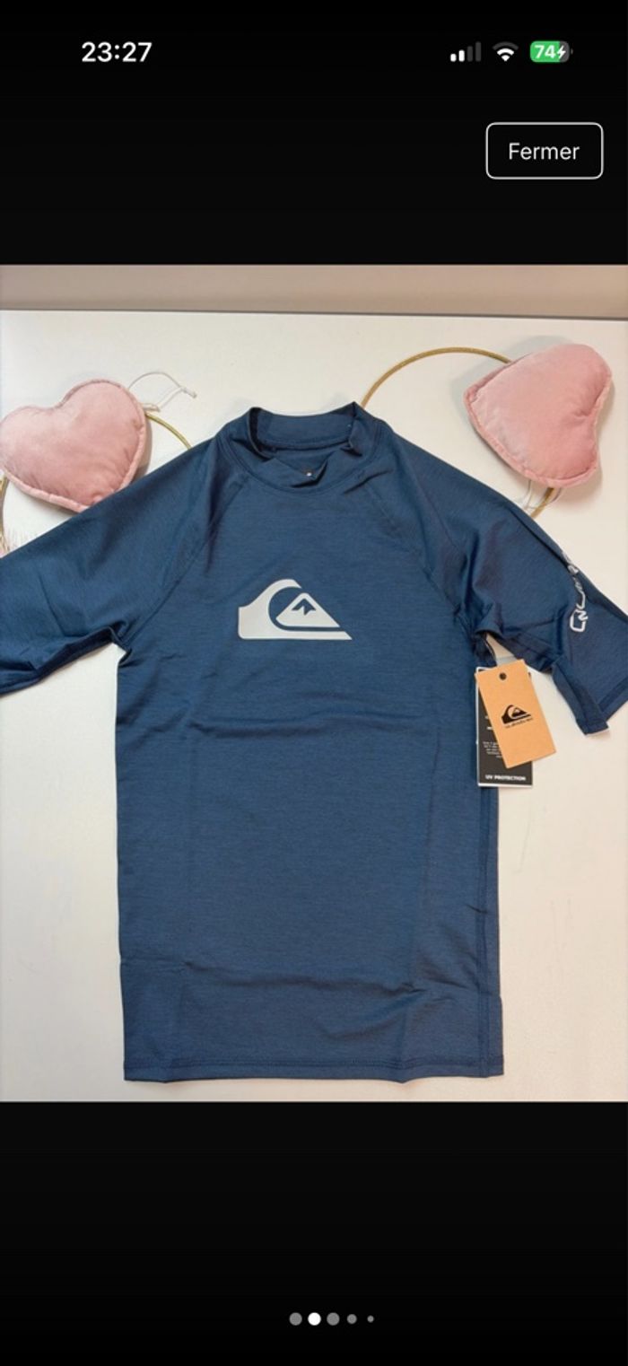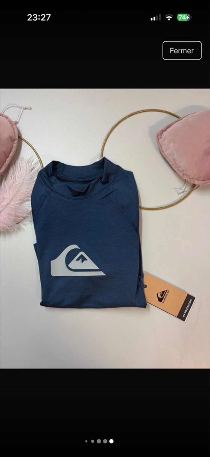 un haut de protection solaire (rashguard) à manches courtes de la marque Quiksilver, idéal pour protéger les enfants ou ados du soleil lors des activités nautiques. • État : Neuf avec étiquettes d'origine. • Couleur : Bleu marine • Protection : Certifié UPF 50+ (protection UV maximale) comme indiqué sur l'étiquette. • Détails : Logo Quiksilver noir sur la poitrine et marquage sur la manche gauche. • Propriétés : Résistant au chlore et conçu pour une utilisation prolongée dans l'eau. État: neuf avec étiquette Marque : Quiksilver Taille : 14 ans #ferreirasabboy14ans #quiksilver #lycra #uvprotection #upf50 #surf #baignade #neuf #bleu #piscine #ete