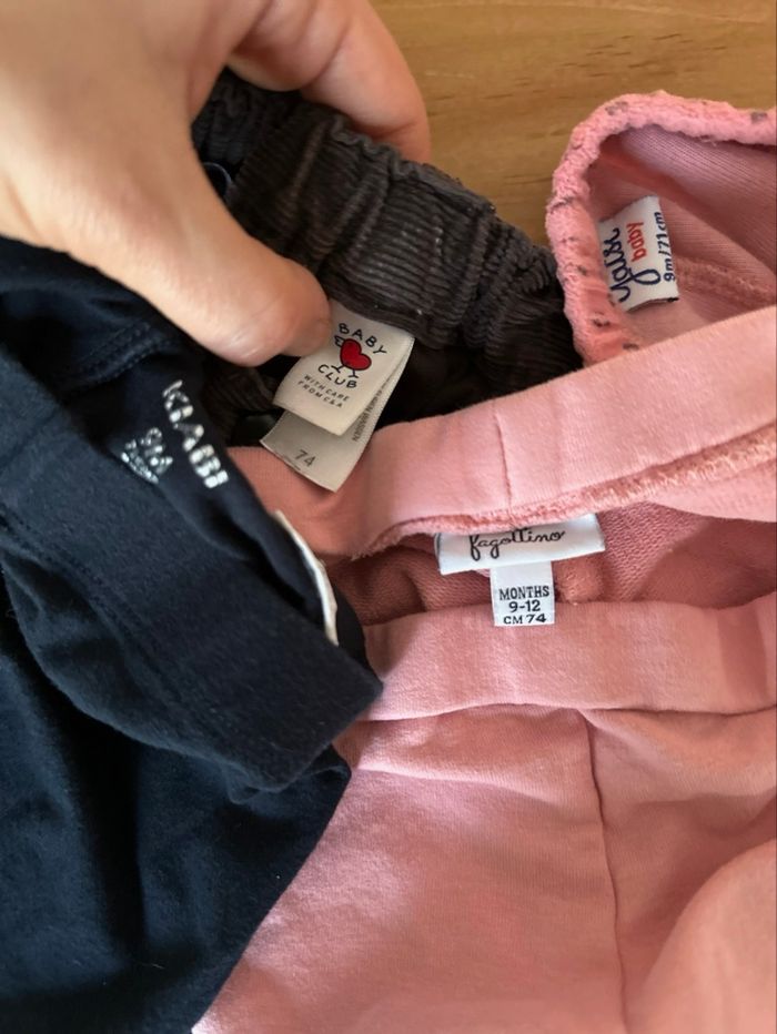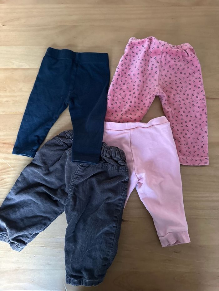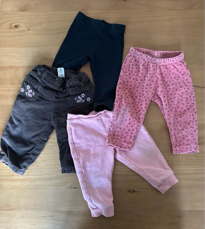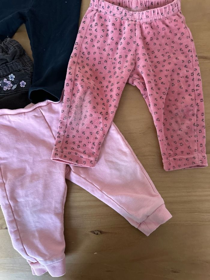 Lot pantalons leggings et velours 9 mois très bon état Que les leggings roses la couleur est légèrement passée au niveau des genoux Plusieurs marques visibles dernière photo