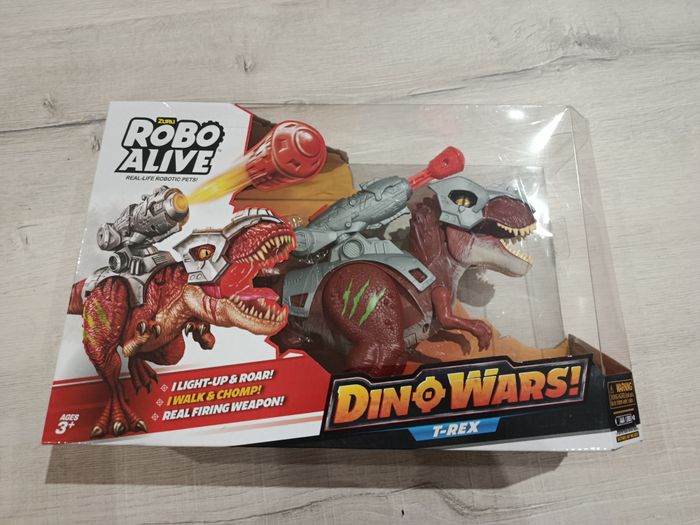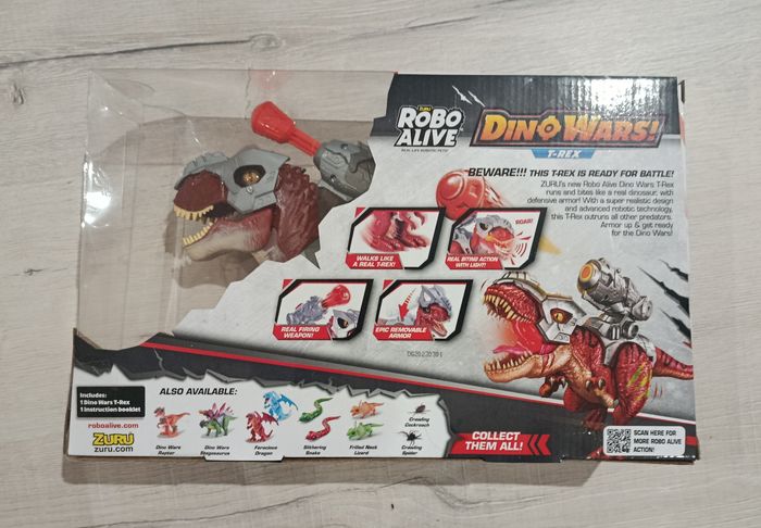 Robo Alive T-Rex, neuf sous emballage. Informations notées sur l'emballage: - Marche comme un véritable T-Rex ! - Action de morsure réelle avec lumière ! - Arme intégrée ( fictive bien sûr !) - Armure épique amovible Inclus dans le contenu: - 1 Dino Wars T-Rex - 1 notice