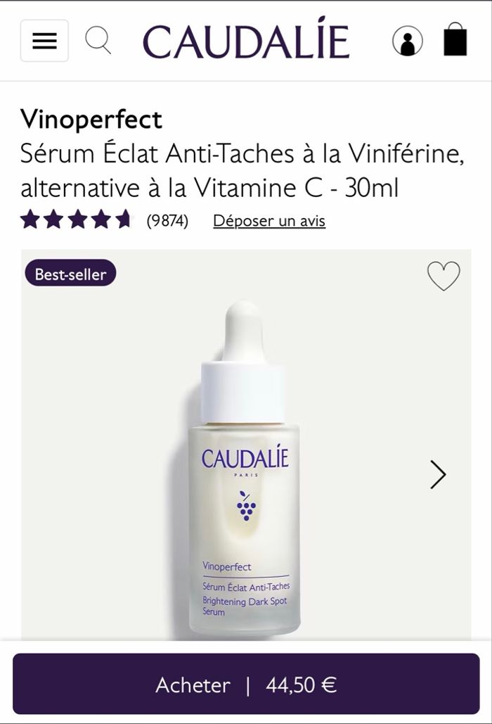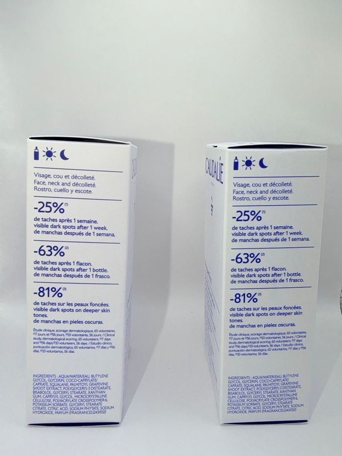 Je vends un lot de 2 sérums Vinoperfect de Caudalie, soin iconique anti-taches. 50€ Le lot de 2 !! -Corrige les taches (soleil, acné, âge, grossesse) -Illumine et unifie le teint -Convient à toutes les carnations -Format 30 ml chacun -Produits neufs, jamais ouverts, Idéal pour faire des économies ou pour une routine sur la durée.