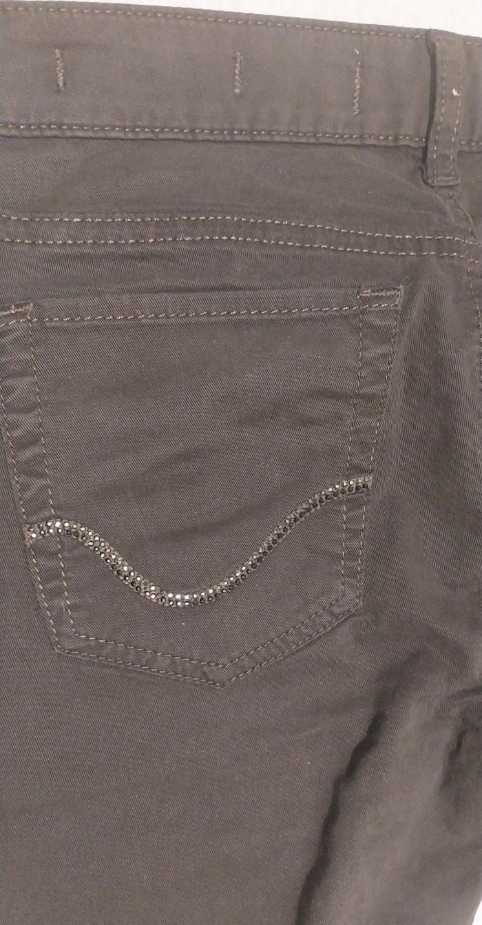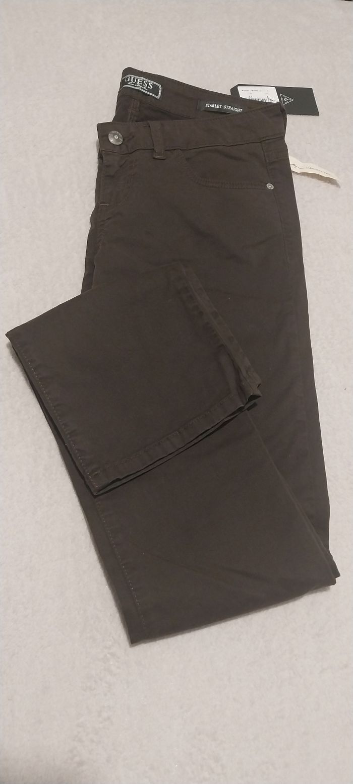 Neuf avec étiquette. Taille 27, correspond à un 36. Couleur marron avec motifs brillants sur les poches arrière.