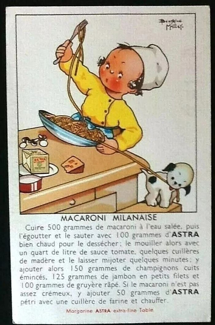 Carte postale ancienne Publicité Margarine Astra Illustrateur Béatrice Mallet (1896-1951) Recette Macaroni Milanaise