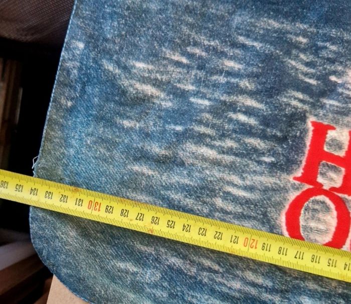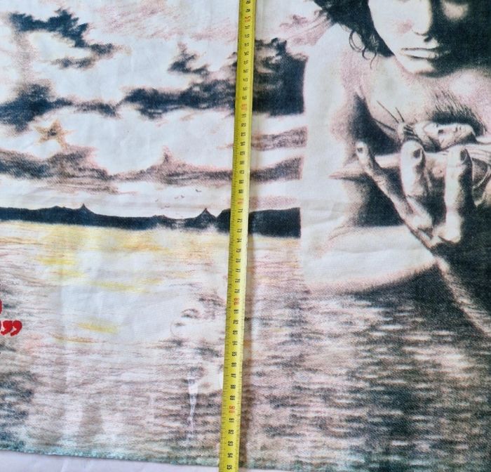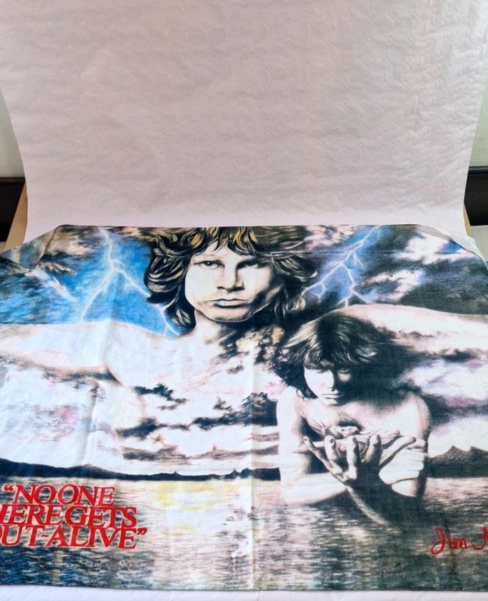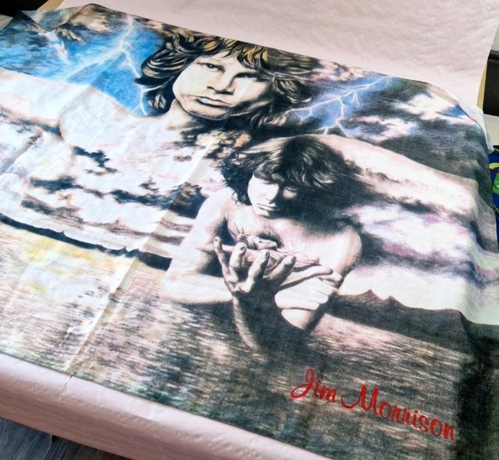 Bonjour. ​Vends une grande tenture murale (type drapeau souple) à l'effigie de Jim Morrison, iconique chanteur des Doors. Le visuel affiche un portrait du chanteur sur un fond de paysage avec éclairs, complété par sa signature "Jim Morrison" en rouge. ​L'objet mesure environ 135 cm de largeur pour 95 cm de hauteur (mesures visibles sur photos). Les finitions sur les bords sont surjetées. Le tissu présente une patine vintage avec un aspect légèrement délavé par endroits, typique de ce genre de support. ​ #jimmorrison #thedoors #rock #vintage #music #deco #tenture #drapeau