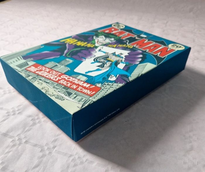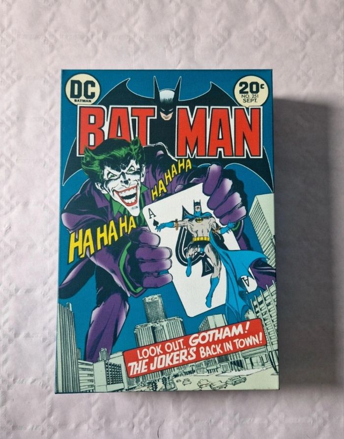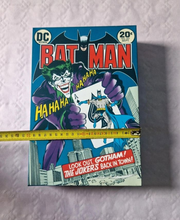 Bonjour. ​Vends un tableau décoratif rigide représentant la couverture du comic Batman n°251. Ce modèle est lumineux (rétroéclairé) . ​L'objet mesure 30 cm de hauteur pour 20 cm de largeur. Il est monté sur un support rigide épais. Au dos, deux attaches sont intégrées pour une fixation murale facile. Mention "© & ™ DC Comics (s16)" présente. L'image est nette, les couleurs sont vives et le système de rétroéclairage est intégré à la structure. ​ #batman #joker #dccomics #comics #deco #lumineux #tableau