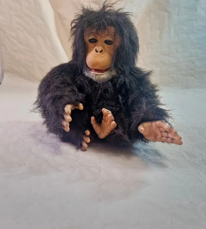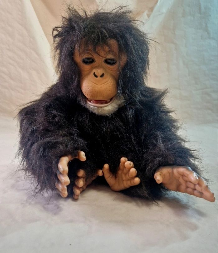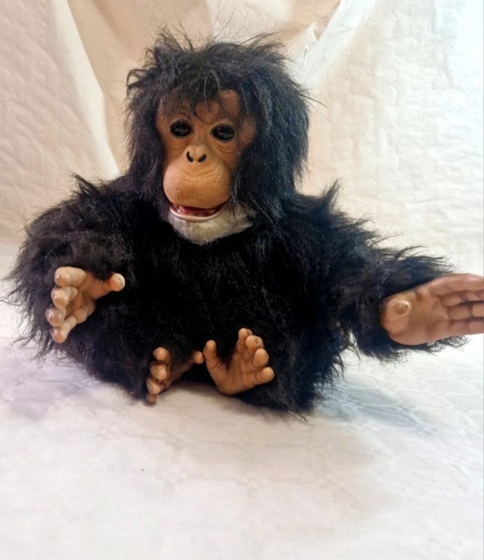 Bonjour, ​Je propose ce chimpanzé interactif "Cuddle Chimp" de la gamme FurReal Friends (Hasbro / Tiger Electronics, 2005). C'est l'un des modèles les plus expressifs de l'époque. ​Détails techniques et état : ​Fonctionnement : Robotique complexe avec capteurs de mouvement et de contact. Il émet des sons de singe, tape des mains quand il est content et ses bras sont articulés pour simuler des câlins. ​Référence : Modèle n°75798. ​État physique : Description factuelle : le pelage noir est bien conservé. On note des traces d'usage normales sur les extrémités en plastique (mains, pieds, visage) visibles sur les photos. ​fonctionne parfaitement ​ #Hasbro #FurReal #TigerElectronics #CuddleChimp #VintageToys #Annee2000 #RobotInteractif