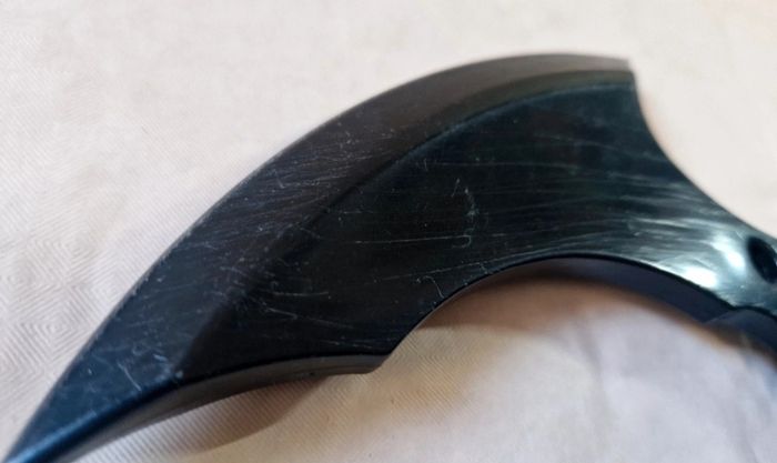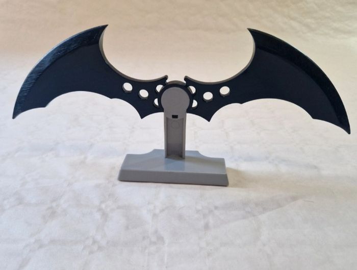 Bonjour, ​Je propose cette réplique du célèbre Batarang de Batman, issue de l'univers DC Comics. Il s'agit d'un objet de collection datant de 2009. ​Détails de l'objet : ​Dimensions : L'envergure est d'environ 38 cm. ​Support : Livré avec son socle d'exposition gris d'origine. ​Authenticité : Marquage "TM & © DC Comics (s09)" visible sous le socle. ​État physique : Présence de nombreuses micro-rayures et marques d'usure sur la surface noire du Batarang, particulièrement visibles à la lumière (voir photos de détail). Le plastique présente des traces de frottement. ​Complétude : Complet avec son support, sans boîte d'origine. ​ #Batman #DCComics #Batarang #ArkhamAsylum #Comics #Collector #SuperHero