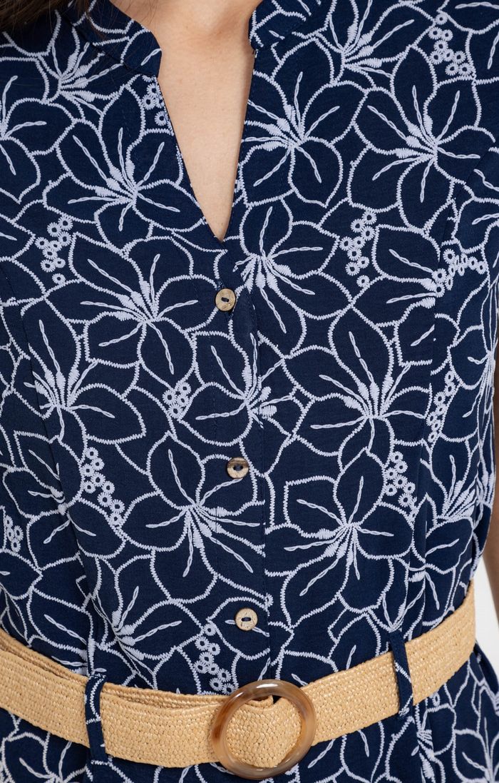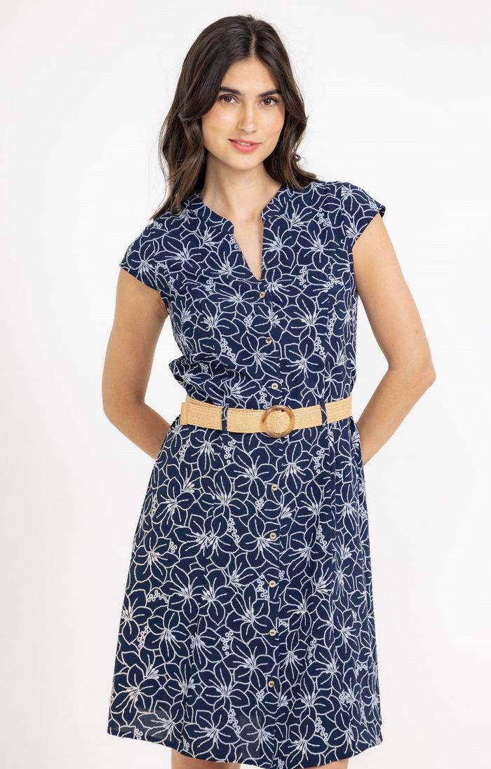 Robe chemise avec boutons et ceinture - taille 46 - Armand Thiery Robe boutonnée à manches courtes à broderies végétales avec ceinture. Coupe cintrée. Longueur genoux. Mancherons. Emmanchures droites. Col rond combiné à une découpe V. Fermeture à boutons effet coco. Broderies fleurs et feuilles en teinte contrastée. Matière fluide. Taille élastiquée au dos. Passants pour ceinture. Ceinture élastiquée tressée façon raphia à boucle ronde marbrée. Tissu principal : 100% POLYESTER
