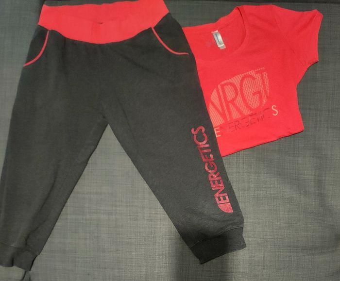 Tenue composée d'un jogging court sans le cordon mais qui n'est pas indispensable puisque cela tient très bien et d'un t-shirt à manches courtes. Très bon état. Coloris : orange