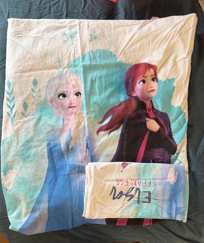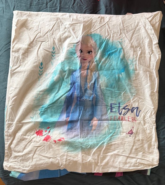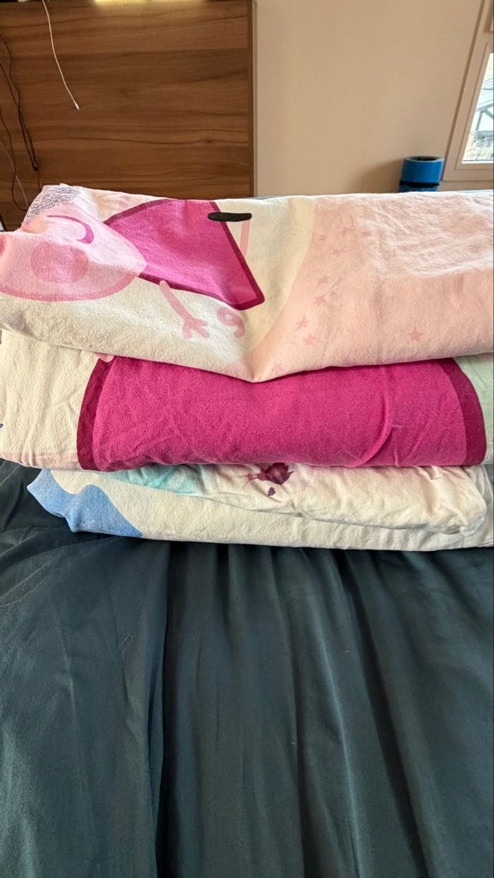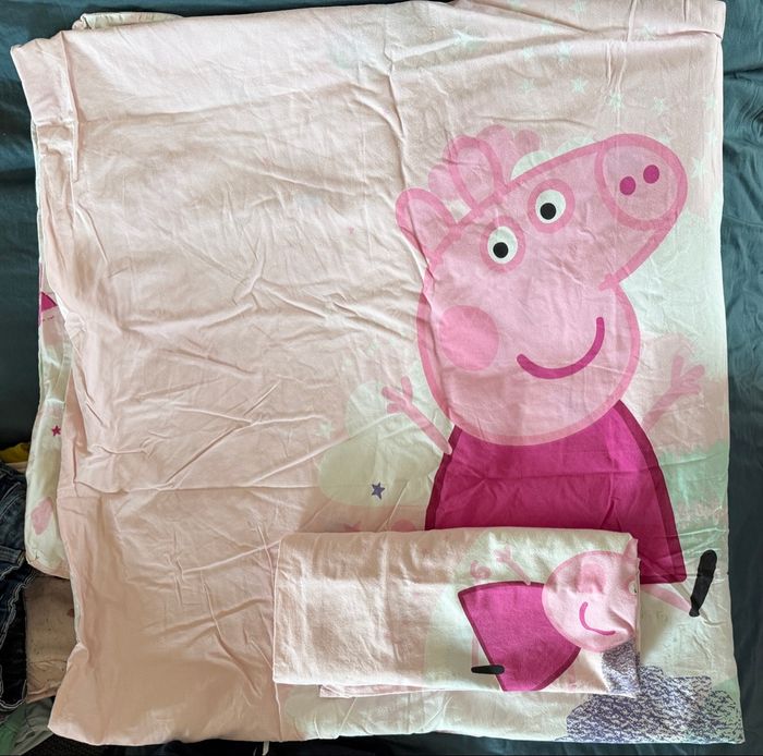 Peppa pig une place housse et taie d’oreiller en parfait état Reine des neiges une place housse et taie Les housses ont été lavées Mais sur celle de la reine de neige il y a qq taches qui ne sont pas parties