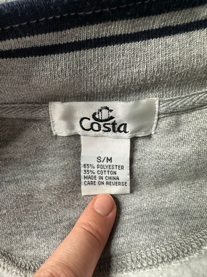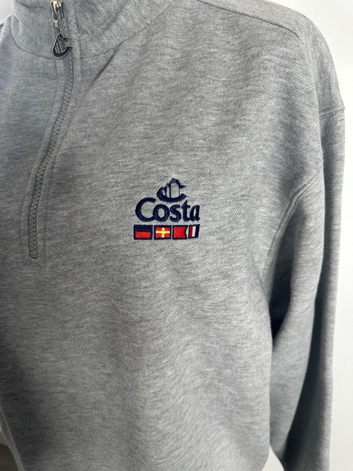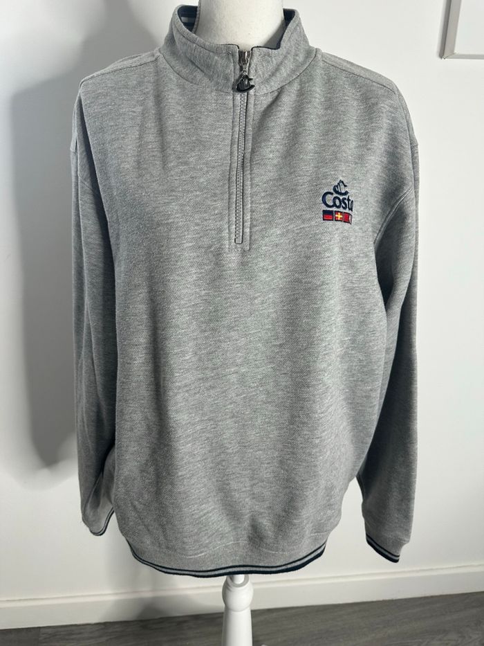 Sweatshirt - Excellent état - Taille 36/38 équivalent S/M Dimensions en bas de l’annonce - Couleur gris et bleu marine - Costa et drapeaux brodés au niveau de la poitrine - Demi zip au niveau du col - Intérieur polaire - Ultra doux et chaud - Ajusté sur le bas - Polyester et coton Dimensions: - 58cm niveau épaules - 62cm niveau aisselles - 67cm de long - 46 à 55cm en bas