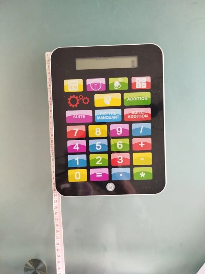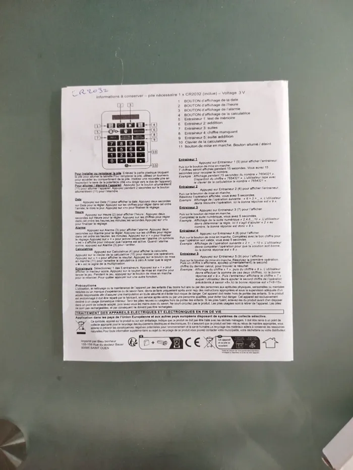 Fonctionnement avec pile CR2032. Notice incluse. Hauteur 24cm. Très peu servie, elle fonctionne parfaitement. Plusieurs fonctionnalités (photo notice). Traces de marqueurs au dos