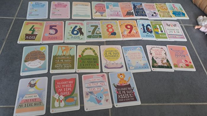 30 cartes étapes pour se souvenir des grandes étapes de la première année de votre enfant. Acheté chez natures et découvertes. Comme neuf, juste une carte étape avec du correcteur blanc (cf photo). Mondial relay et colissimo privilégié.
