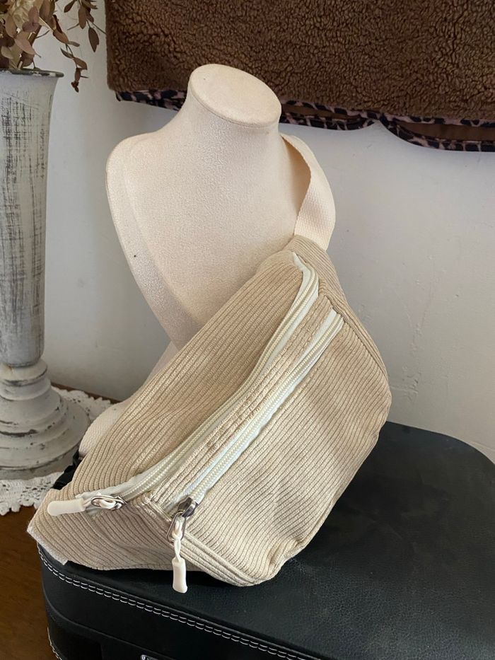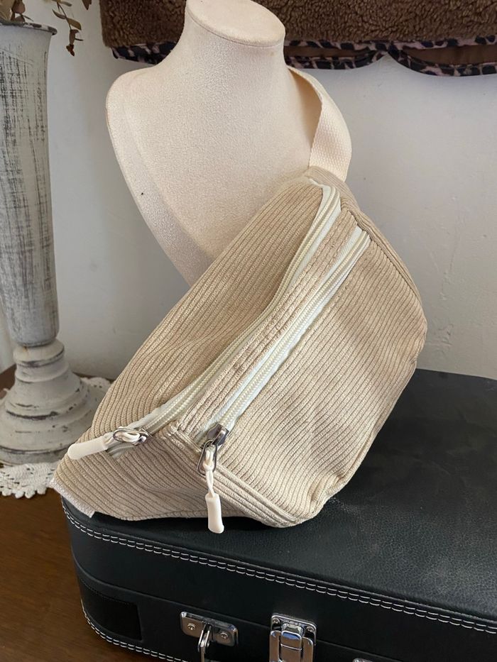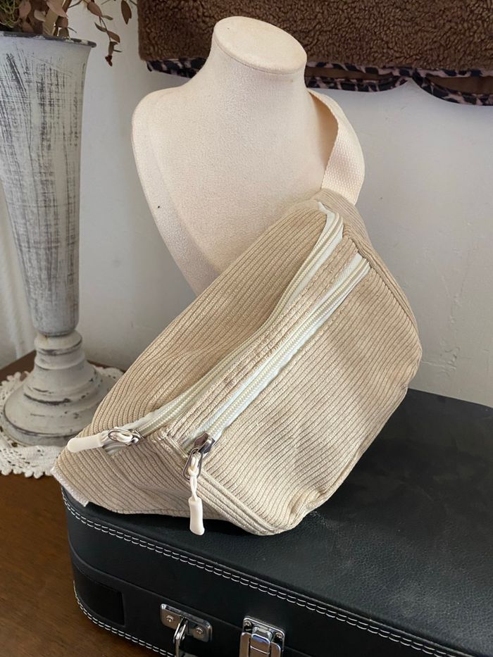 🤍 Sac banane beige côtelé – Très bon état Sac banane en tissu côtelé beige clair, avec double fermeture éclair blanche. Couleur neutre facile à assortir, style bohème et tendance 🌿 🧵 Matière douce et agréable ✨ Double zip pratique 📏 Longueur : 30 cm 📏 Hauteur : 15 cm Très bon etat