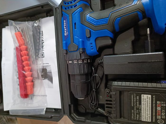 Perceuse visseuse dayplus avec une batterie et chargeur idéal bricolage couleur bleu avec accessoires foret+embout pour visser
