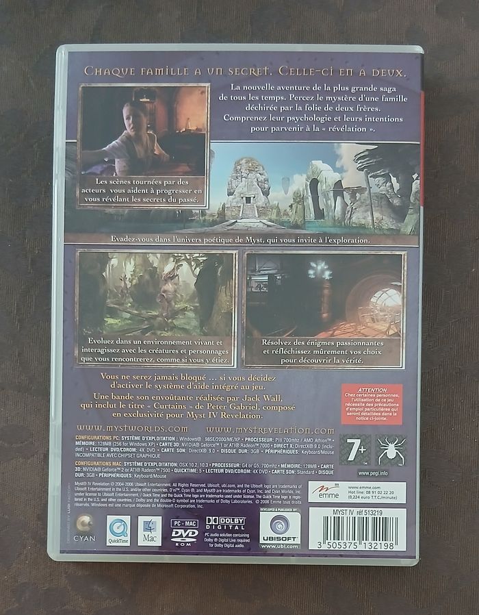Jeux "Myst IV Revelation" en EXCELLENT ÉTAT et compatible sur PC / MAC. Jeux rétro d'aventure, d'enquête et d'exploration narrative de 2006. Mise sous papier bulle et soin sur l'emballage pour une expédition sûre et votre colis en sécurité #pc #jeuxvidéo #jeuxvidéopc #jeuxpc #lotjeux #lotjeuxpc #blizzard #ubisoft #montecristo #atari #jowood #codemasters #jeuxaction #jeuxaventure #jeuxrpg #jeuxstratégie #jeuxblizzard #jeuxatari #jeuxubisoft #jeuxcodemasters #jeuxtriumphstudios #jeuxwarnebrosgames #jeuxwbgames #jeuxhéroiquefantasie #jeuxfantaisie #rétro #jeuxrétro #vintage #jeuxvintage #overlord #jeuxoverlord #batman #jeuxbatman #lotjeux #lotjeuxpc #minilotjeux #minilotjeuxpc #jeuxneverwinternights #neverwinternights #myst #jeuxmyst #spellforce #jeuxspellforce #diablo #jeuxdiablo #silverfall #jeuxsilverfall #jeuxneuf #neuf #jeuxpcneuf #jeuxpctrèsbonétat #trèsbonétat