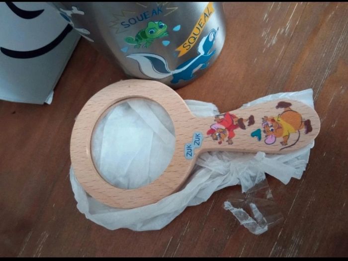 Le coffret contenant les produits est abîmé, par contre à l'intérieur tout est neuf et en très bon état. Comprends une gourde métal, 3 carnets, un coffret feutres et tampons et une loupe en bois.