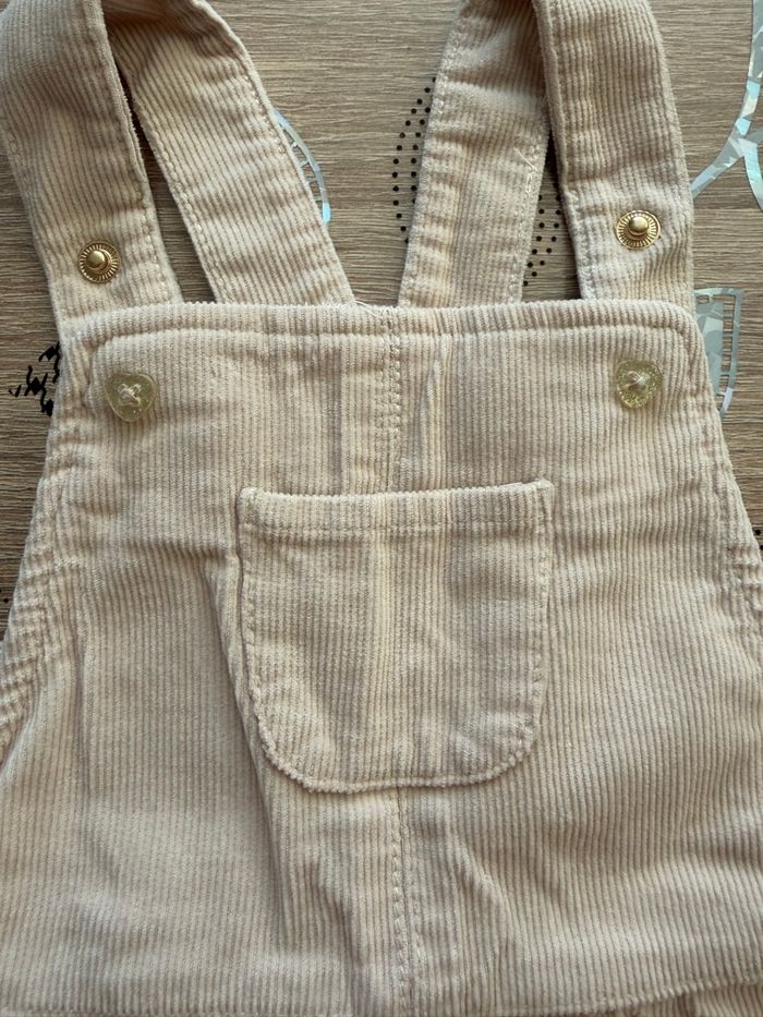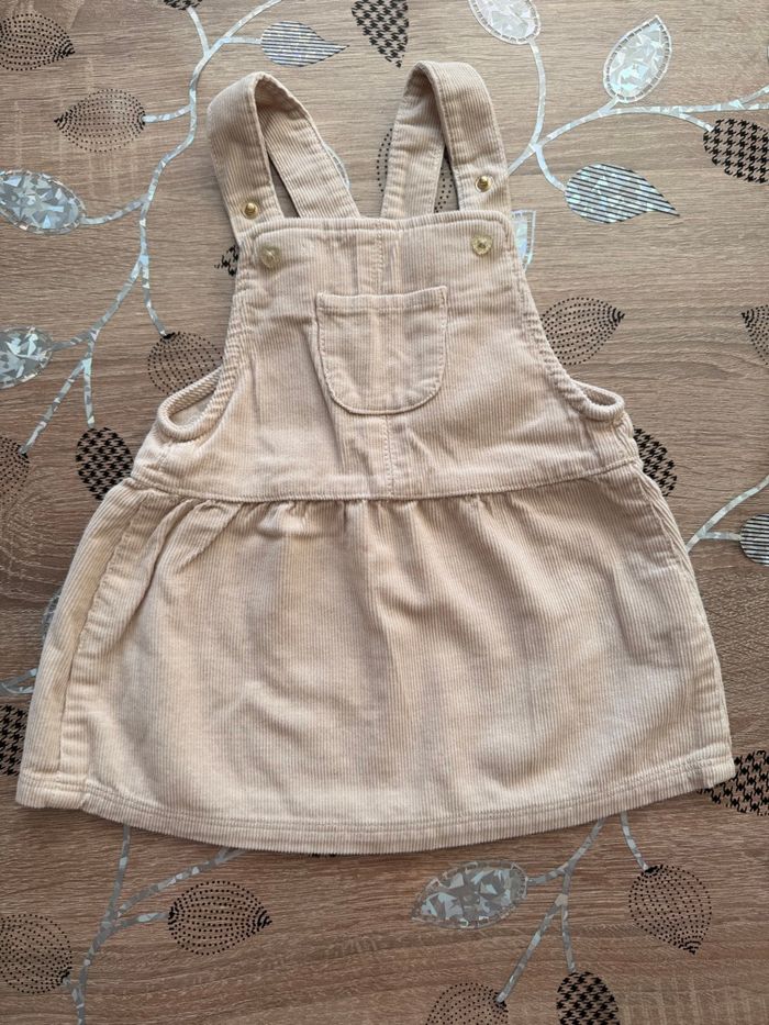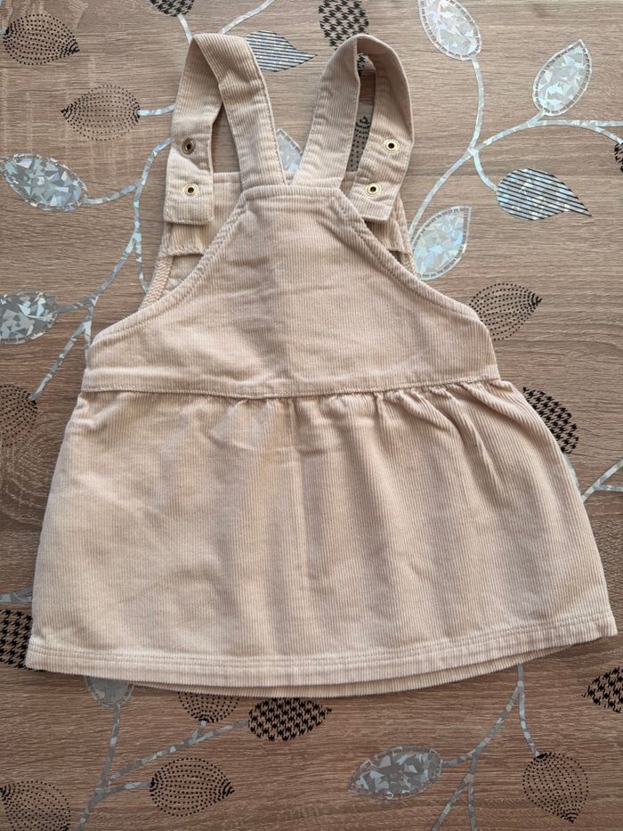 Jolie robe salopette en velours côtelé, coloris beige doux. Bretelles réglables, petite poche devant. Confortable et facile à assortir. Très bon état, idéale mi‑saison Taille : 9 mois Marque : Tape à l’œil