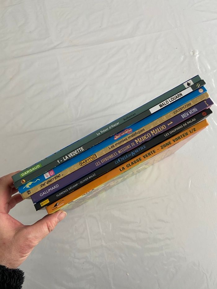Idéal pour les enfants qui aiment les récits complets, l'histoire et les enquêtes. Un mélange de classique et de moderne : • Les Effroyables Missions de Margo Maloo (Indispensable !) • Papyrus (Les momies maléfiques) • Le Cycle du Nautile (Les dauphins de Palau) • Le Trésor d'Alazar (Aventure classique) • La Vedette (BD sport/foot par Malo Louarn) • Samantha (Tome 1) • La Classe Verte (Zone Vortex État : Propre, prêt à lire.