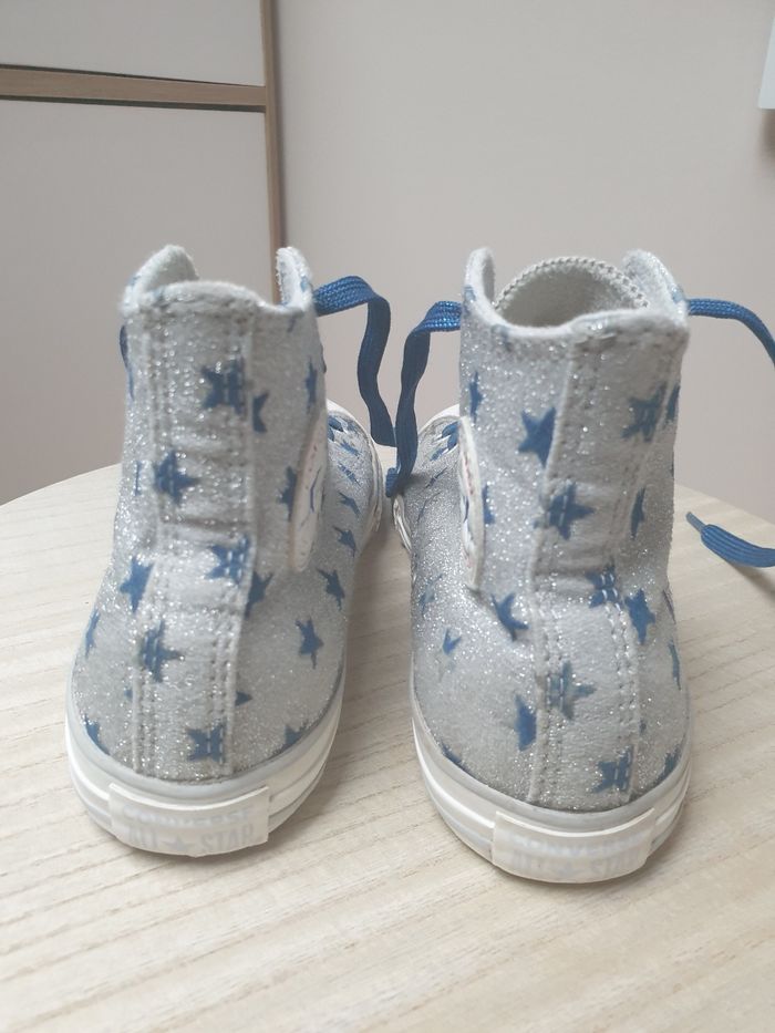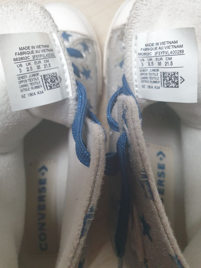Les étoiles se sont un peu effacées, surtout à l'intérieur de la chaussure droite et il y a de petites tâches à l'extérieur de la chaussure droite (voir photos), mais elles restent stylées 🤩 L'intérieur est doublé par en tissu éponge,  ce qui les rend un peu plus confortables et chaudes que les Allstars classiques. C'est une taille 35 junior, elles sont un peu moins larges que les 35 rayon adulte.